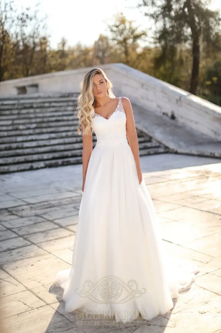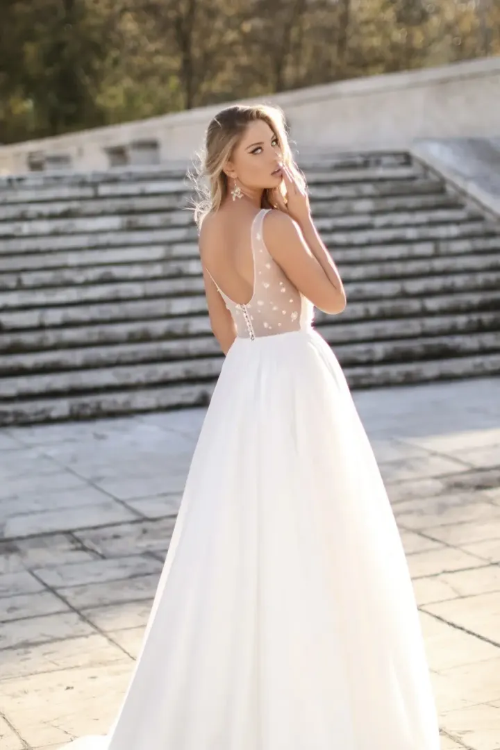 A szoknya csillámos tüll anyagból készült, amely több rétegben omlik alá, lágy esést és romantikus megjelenést adva. A ruha hátát átlátszó tüll alkotja, amelyet szintén flitterek díszítenek — ez a modern, kifinomult részlet igazán különlegessé teszi a ruhát.