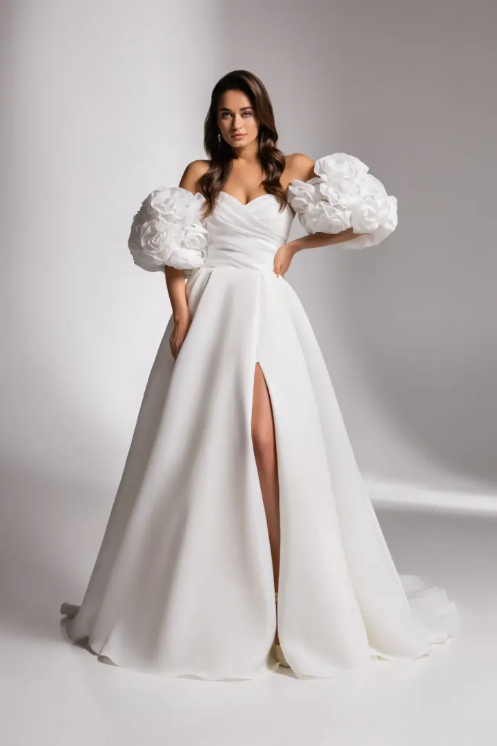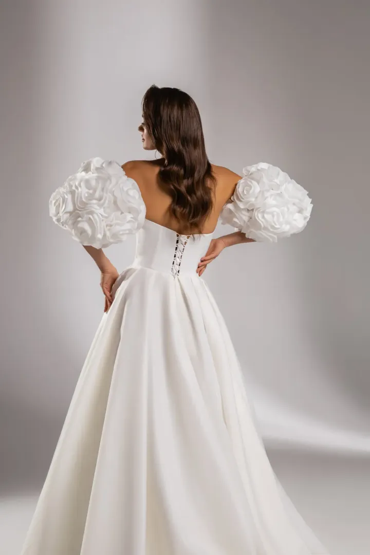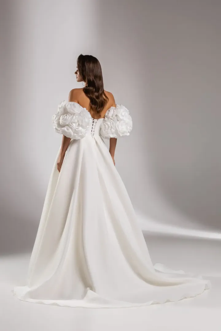 Az R10 modell egy igazán különleges A-vonalú menyasszonyi ruha, amely a klasszikus eleganciát ötvözi a modern részletekkel. Felsőrésze merevítős, kosarakkal kialakított, hátul nyitott, cipzárral és fűzővel záródik, ami tökéletes illeszkedést biztosít. A puffos ujjakon kézzel készült virágdíszek találhatók, amelyek finom romantikát és egyedi bájt kölcsönöznek a ruhának. Az átlapolt szoknya lágy esésű organza-szatén anyagból készült, amely elegánsan követi a mozdulatokat, míg a 50 cm-es uszály méltóságteljesen egészíti ki az összképet. Ez a ruha ideális választás azoknak a menyasszonyoknak, akik egy nőies, látványos, mégis kifinomult öltözetben szeretnének kimondani az igent.