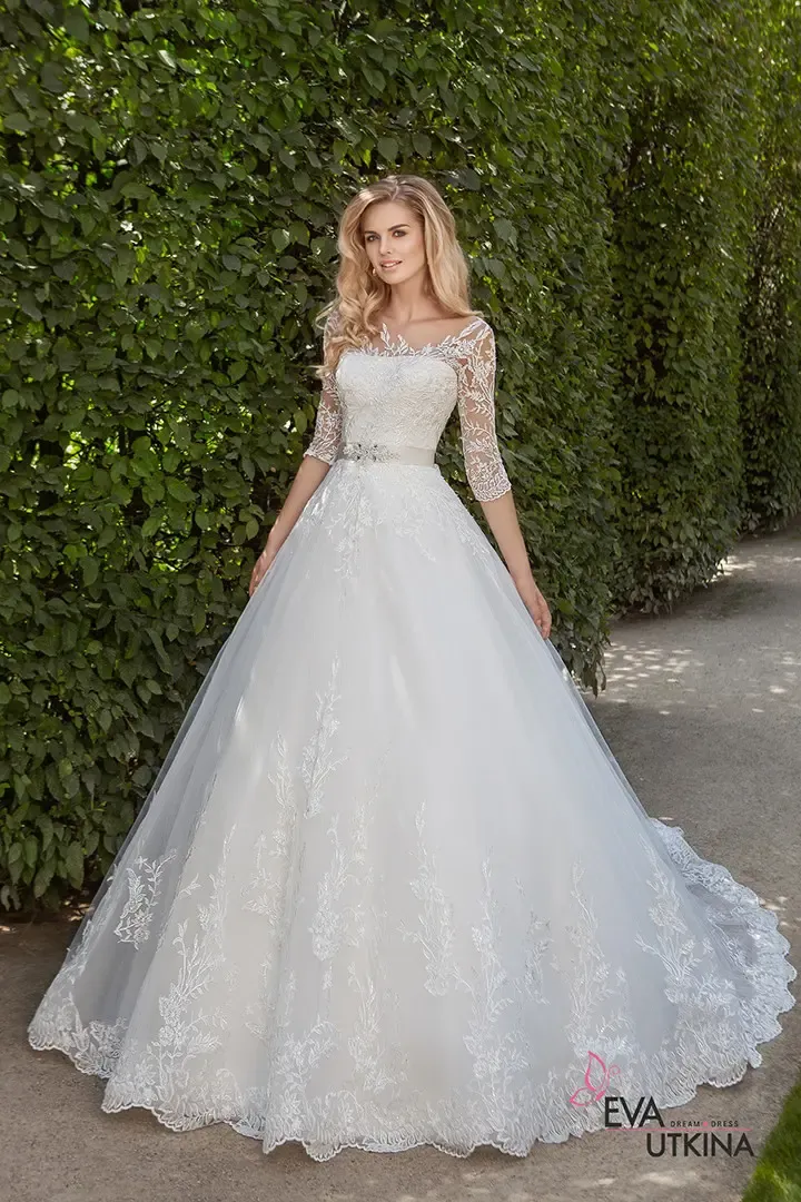 A Barbara menyasszonyi ruha a klasszikus romantika és a modern elegancia tökéletes találkozása. A finom francia csipke díszítés a felsőrészen, a dekoltázs körül és a 3/4‑es ujjakon is megjelenik, így igazán nőies és kifinomult hatást kelt. A könnyed A‑vonalú szoknya gyönyörűen követi a test vonalát, majd lágyan omlik alá az uszályba, amely méltóságteljes megjelenést biztosít a nagy napon.