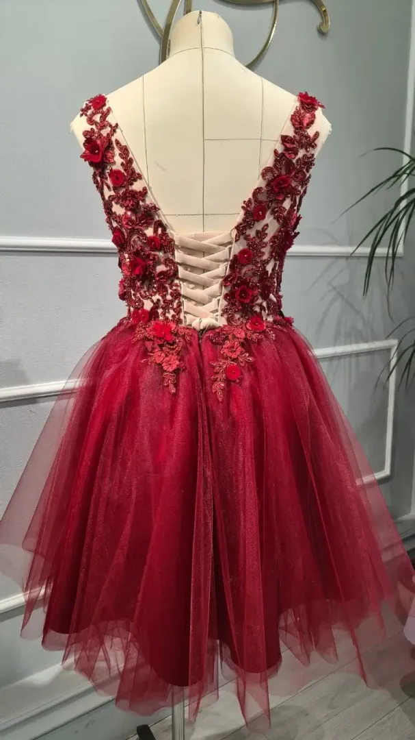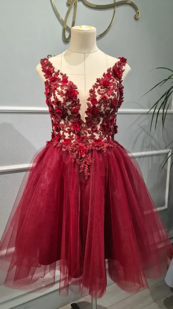 A Burgundi rövid ruha tökéletes választás menyecske ruhának vagy elegáns megjelenéshez. A gazdagon díszített bordó csipke gyönyörűen érvényesül a lágy tüllrétegeken, amely nőies, romantikus és feltűnően elegáns összhatást teremt. A 3D csipkevirágok különleges mélységet és luxushatást biztosítanak a felsőrésznek, finoman kiemelve a ruha karakterét.
