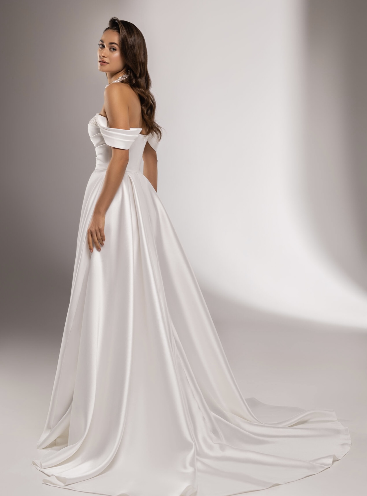 Structured, slightly shiny, modern and elegant. Example: Elite Szalon 2326 gown – a clean, regal mikado design.