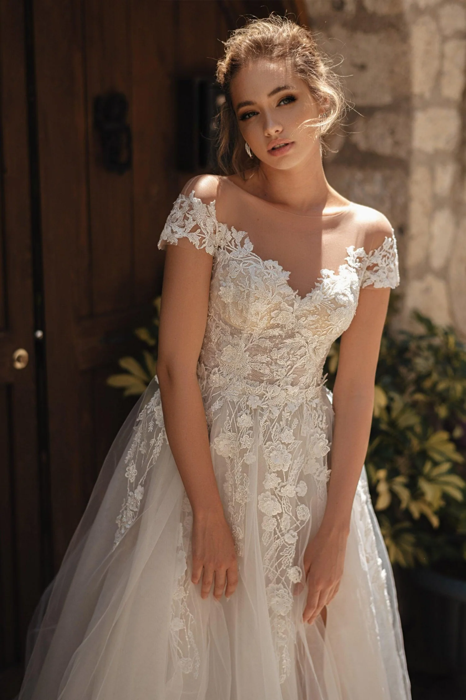 Light, airy and romantic — perfect for princess or A‑line skirts. Example: Elite Szalon 2440 gown – featuring a sparkling tulle skirt that glows beautifully in the light.