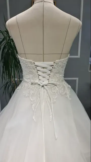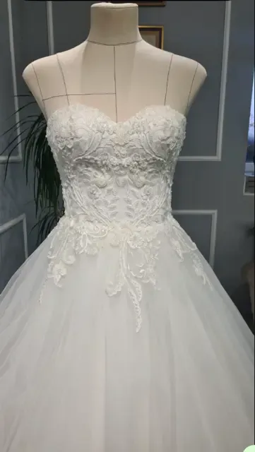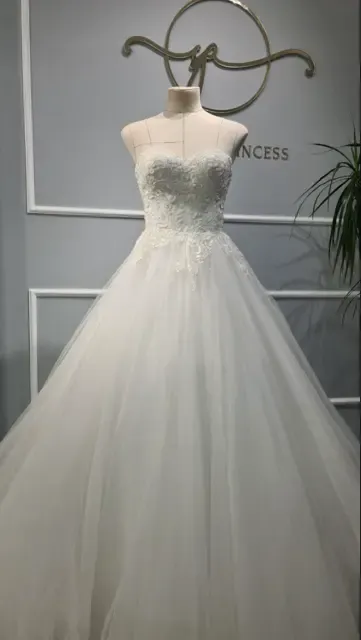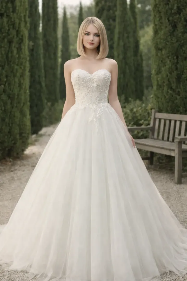 A Vita 1 keringőruha a klasszikus báli elegancia és a modern, fiatalos megjelenés tökéletes ötvözete. A vállpánt nélküli kialakítás gyönyörűen kiemeli a vállakat és a dekoltázst, miközben a csipkével díszített felsőrész romantikus, finom részleteivel varázsol el.