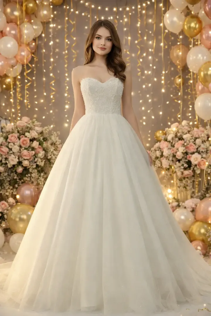 A Vita 2 keringőruha a romantikus részletek és a ragyogó megjelenés tökéletes harmóniáját kínálja. A vállpánt nélküli felsőrész finom csipkéből készült, amelyet aprólékosan kidolgozott, 3D hatású virág applikációk díszítenek. Ezek a kis virágok különleges textúrát és eleganciát adnak a ruhának, miközben gyönyörűen kiemelik a felsőtest vonalait.
