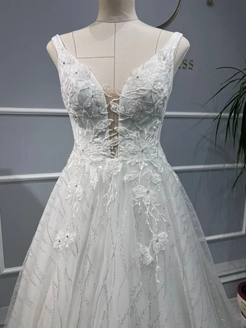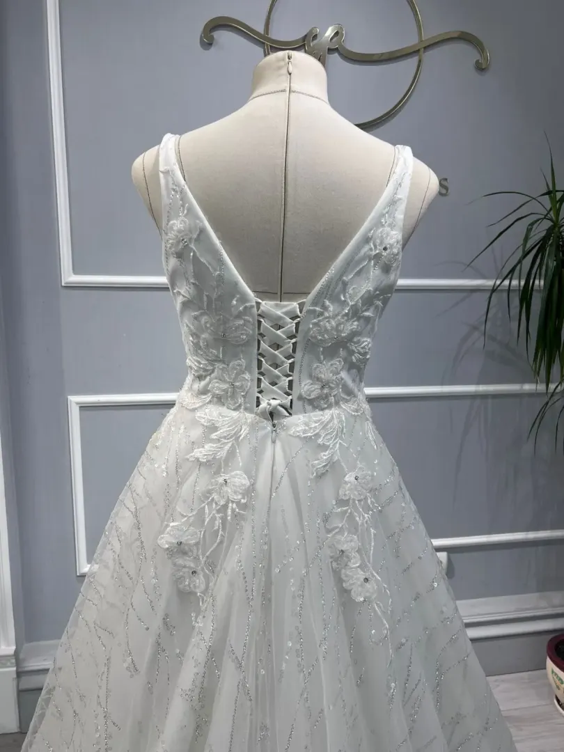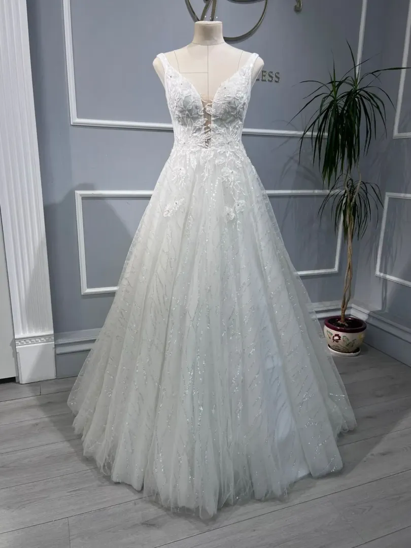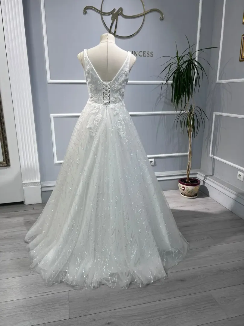 A hátán fűzővel záródik, amely nemcsak dekoratív, hanem lehetővé teszi a tökéletes illeszkedést is. A szoknya különleges, flitterekkel díszített tüll anyagból készült, amely minden mozdulatnál gyönyörűen csillog. A klasszikus A-vonalú szabás elegáns esést biztosít, és nem tartalmaz uszályt, így könnyedén mozoghatsz benne.