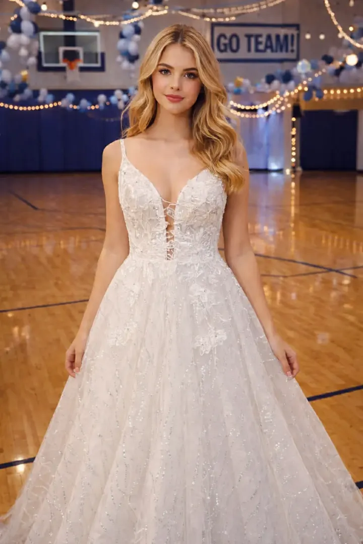 A Vita 3 keringőruha a klasszikus elegancia és a modern csillogás tökéletes kombinációja. A ruha felső része finom csipkével díszített, amely romantikus és nőies megjelenést kölcsönöz. A V alakú dekoltázs kiemeli a felsőtest vonalait, miközben a 2–3 cm széles pánt stabil tartást biztosít, így a ruha kényelmesen viselhető akár hosszabb táncok során is.