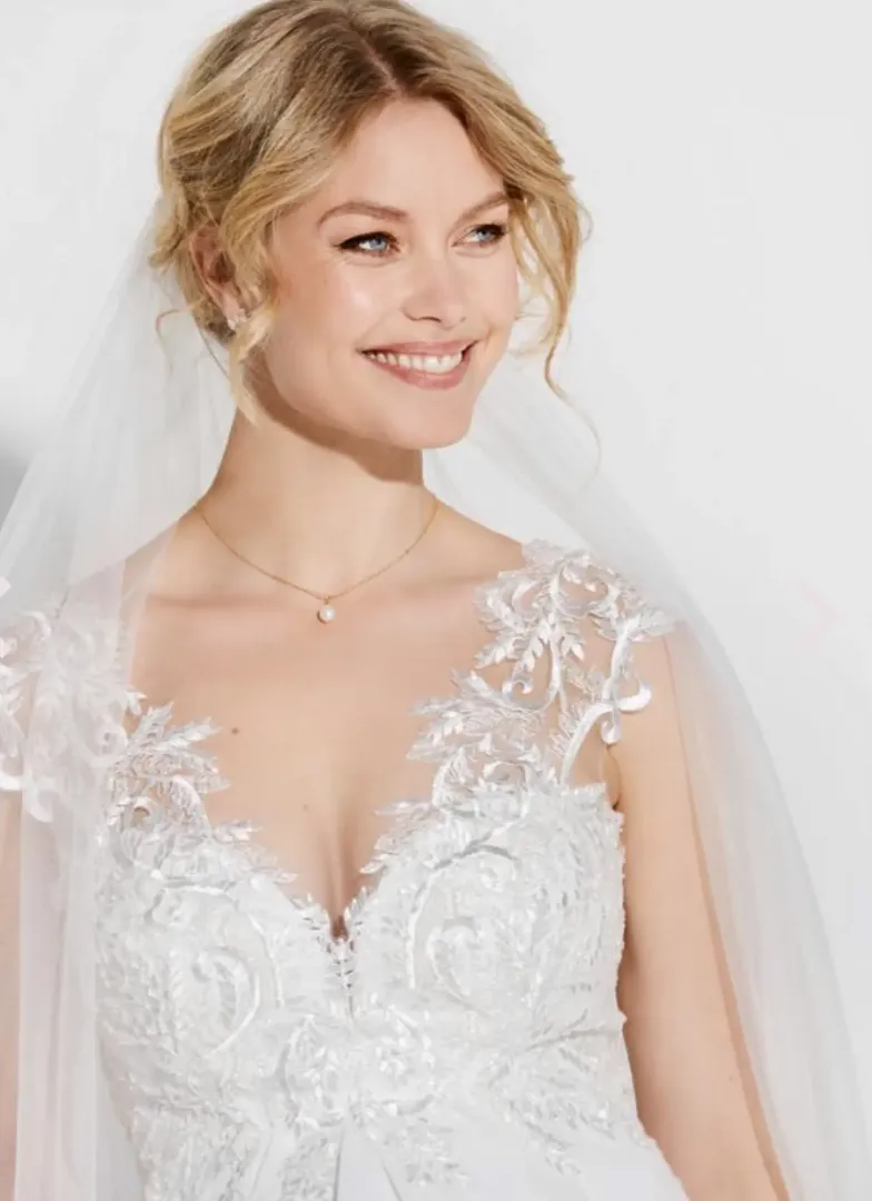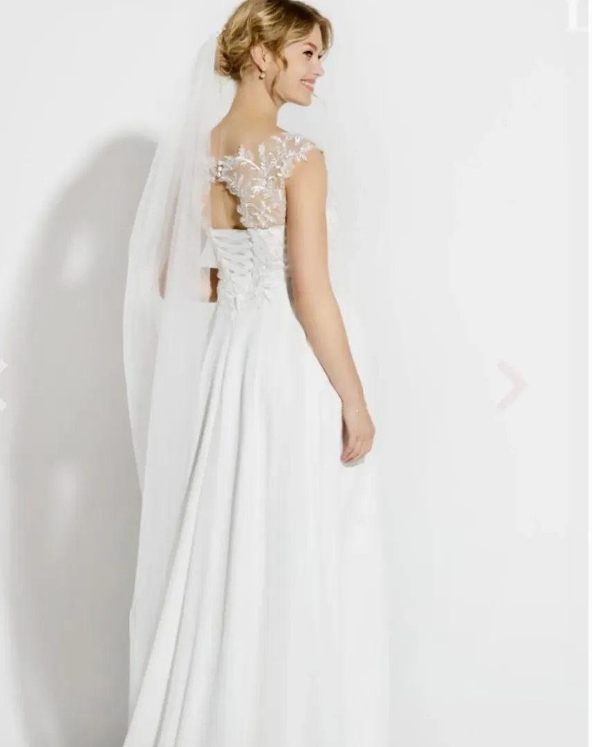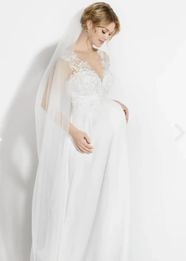 A 2616 kismama menyasszonyi ruha a nőiesség és kényelem harmonikus ötvözete. A felsőrész illúzió tüllre helyezett csodaszép csipkéből készült, amely elegánsan simul a bőrre, finoman rásimulva a vállakra is, különleges, romantikus hatást keltve. A hát részét érdekes kivágás díszíti, amelyet fűzős megoldás zár, biztosítva a tökéletes illeszkedést a várandósság bármely szakaszában. A lágy esésű muszlin szoknya könnyed mozgást enged, így a menyasszony egész nap komfortosan érezheti magát. Uszály nélküli kialakítása praktikus és modern, ugyanakkor megőrzi a klasszikus menyasszonyi eleganciát.
