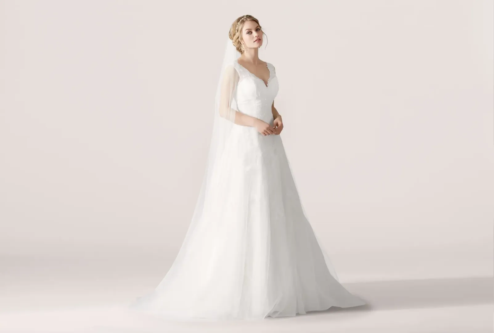 A 3931-es kismama menyasszonyi ruha finom eleganciát és kényelmet kínál a várandósság legkorábbi időszakában. A ruha különleges V-dekoltázsa csipke és tüll harmonikus kombinációjából született, amely gyönyörűen keretezi a felsőtestet. A hátán fűzős záródás biztosítja a tökéletes illeszkedést, míg a vastagabb csipke pántok stabil tartást adnak.