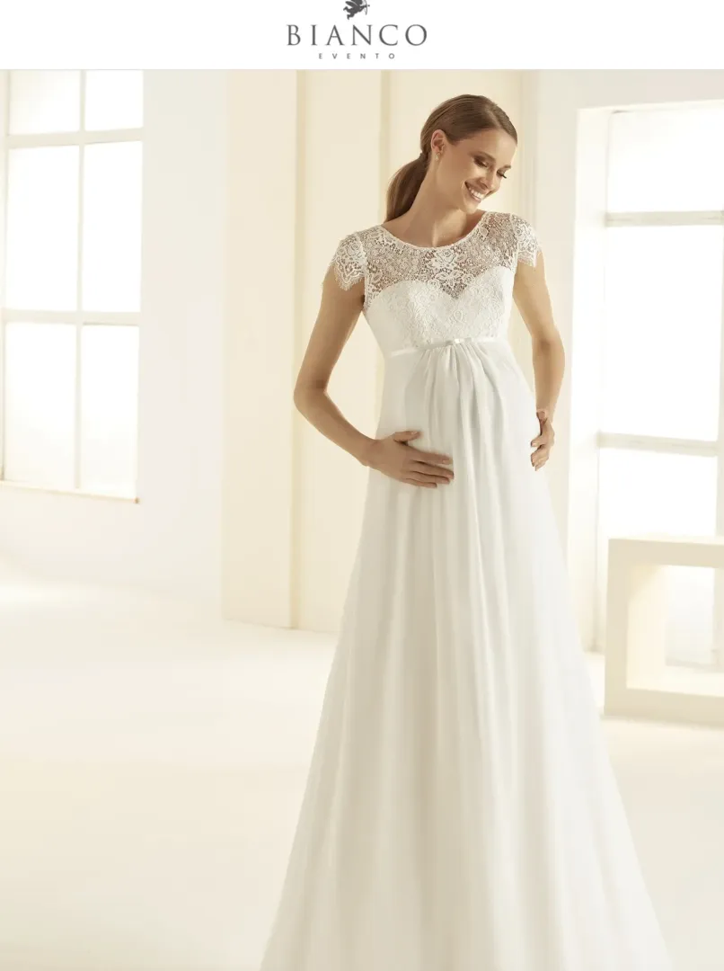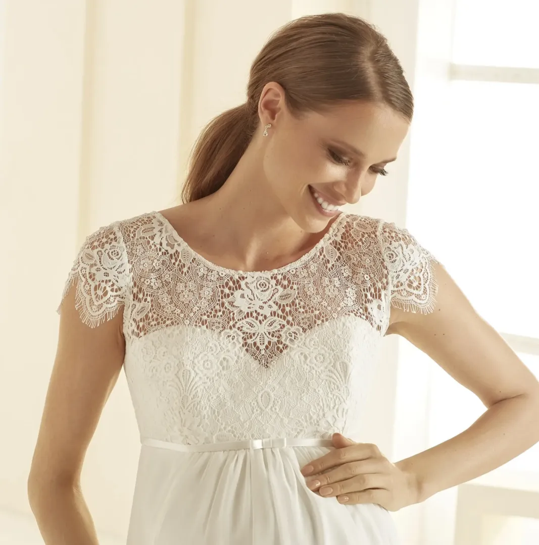 A Bernadett kismama menyasszonyi ruha a romantika és a kényelem tökéletes kombinációja. A felsőrész puha pamut csipkéből készült, amely gyengéden simul a testre, míg a japán csipkéből készült ujjrész különleges, finoman dekoratív megjelenést kölcsönöz. A hát V alakú kivágása nőies és modern részlet, amely elegáns kontrasztot alkot a lágyan omló muszlin szoknyával. A mell alatti szabásvonal és a fűzős hátmegoldás garantálja, hogy a ruha tökéletesen illeszkedjen, akár a várandósság utolsó hónapjaiban is. Uszály nélküli kialakítása könnyed mozgást tesz lehetővé, így ideális választás meghitt, kényelmes, mégis stílusos esküvőkre.