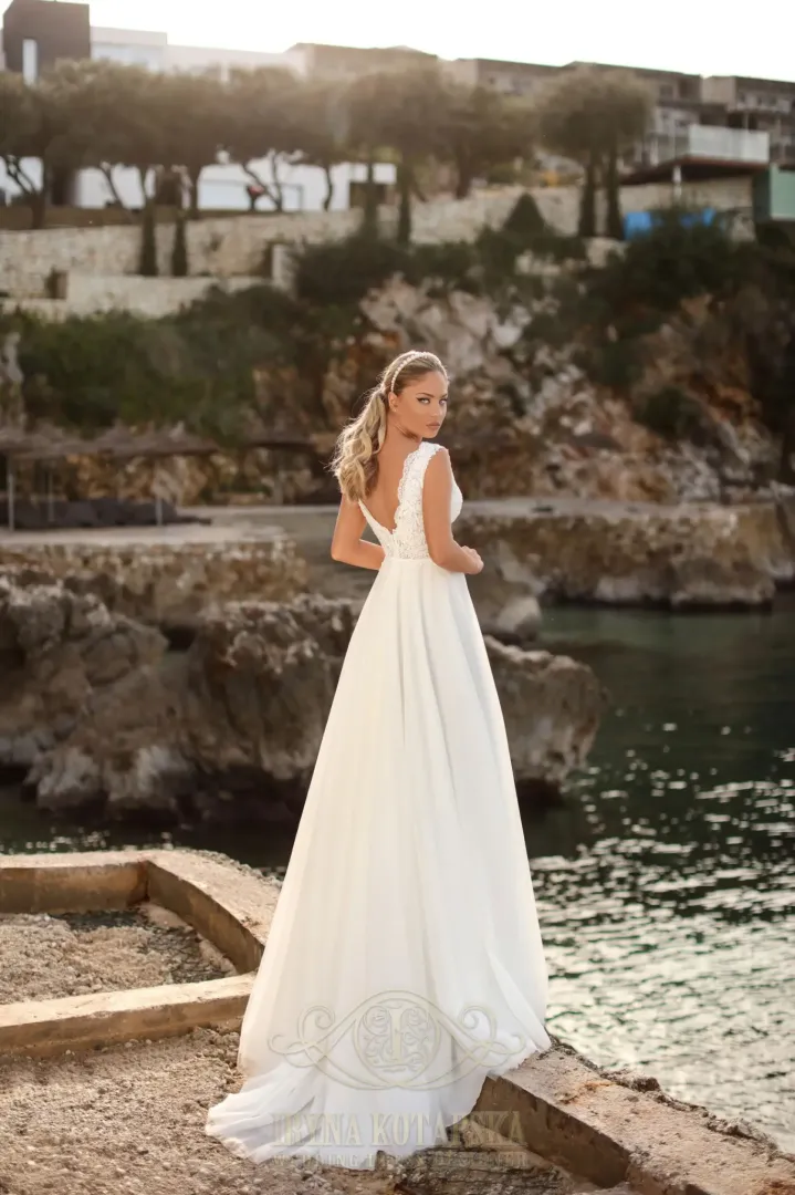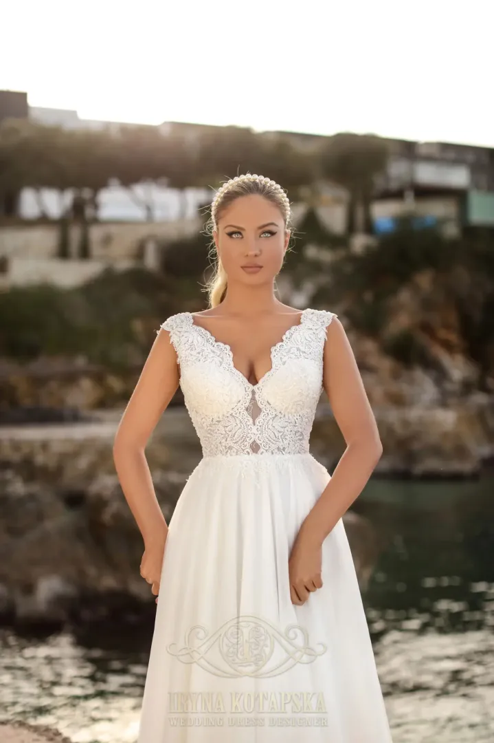 A 2244 fehér kismama menyasszonyi ruha minden részletében a kényelmet és az eleganciát képviseli. Felsőrésze csodálatos csipkével díszített, mélyebb V-kivágással, amely nőies és kifinomult megjelenést biztosít. A sok rétegből álló, lágy tüll szoknya könnyed esésével varázsolja különlegessé az összhatást, miközben kellő mozgásszabadságot nyújt. A hátul található fűzős záródás nemcsak stílusos, hanem praktikus is, hiszen maximális kényelmet biztosít, így akár a későbbi várandóssági hónapokban is ideális viselet. Uszály nélküli kialakítása modern és kényelmes, így ez a modell tökéletes választás a meghitt, elegáns esküvőkhöz.