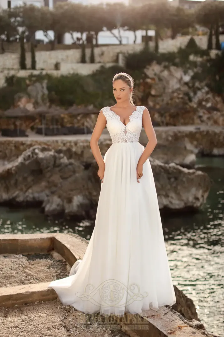 A 2244 kismama menyasszonyi ruha a kényelem és elegancia tökéletes kombinációja. Csipkés, V-kivágású felsőrésze nőies megjelenést kölcsönöz, míg a többrétegű tüll szoknya légies könnyedséget ad. A fűzős hátmegoldás maximális kényelmet biztosít, így a ruha ideális választás a várandós menyasszonyok számára. Bővebben