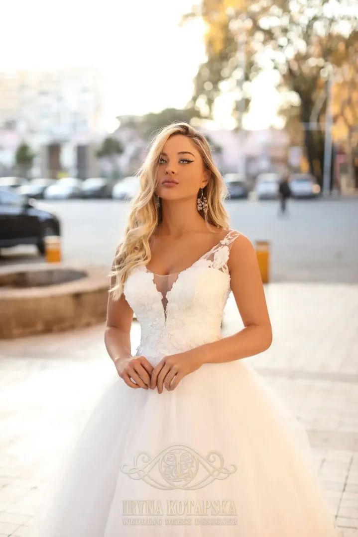 A 2112 menyasszonyi ruha a klasszikus hercegnő stílust ötvözi a modern, praktikus részletekkel. A felsőrészt finom csipke díszíti, melyet kristályok és gyöngyök tesznek különlegessé. A pántos kialakítás és a V-alakú dekoltázs kiemeli a nyakat és a vállakat.