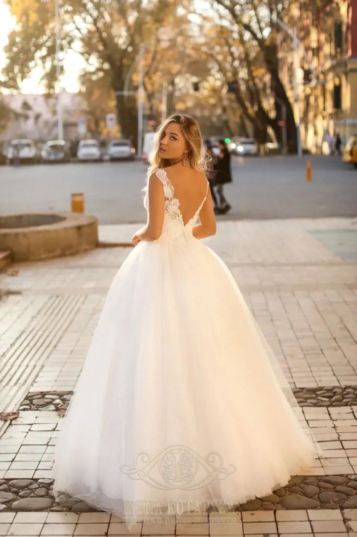 A több rétegű tüll szoknya könnyed mozgást biztosít, miközben ünnepélyes, elegáns hatást kelt. A hátán szintén V-alakú, cipzárral záródik, így kényelmes és praktikus viselet. Uszály nélküli kialakítása miatt polgári esküvőkhöz ideális, könnyen táncolható, mégis látványos választás a nagy napra.