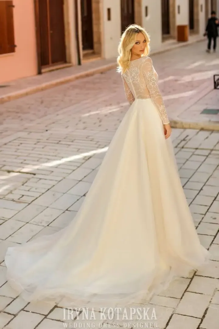 Varázsoljon el mindenkit ezzel a különleges menyasszonyi ruhával! A felsőrészt finom csipke borítja, míg a mély dekoltázs szegélyét gyöngyök és flitterek teszik ragyogóvá. A mandzsetta ékszer gombokkal záródik, eleganciát és kifinomultságot kölcsönözve a ruhának. A szoknya elöl ügyesen sliccelt, így csak akkor tárja fel a lábat, amikor a viselője szeretné, így egyedülállóan kombinálja a klasszikus szépséget a modern, csábító részletekkel. Ez a ruha minden menyasszony számára tökéletes választás, aki stílusosan és magabiztosan szeretné élvezni a nagy napját.