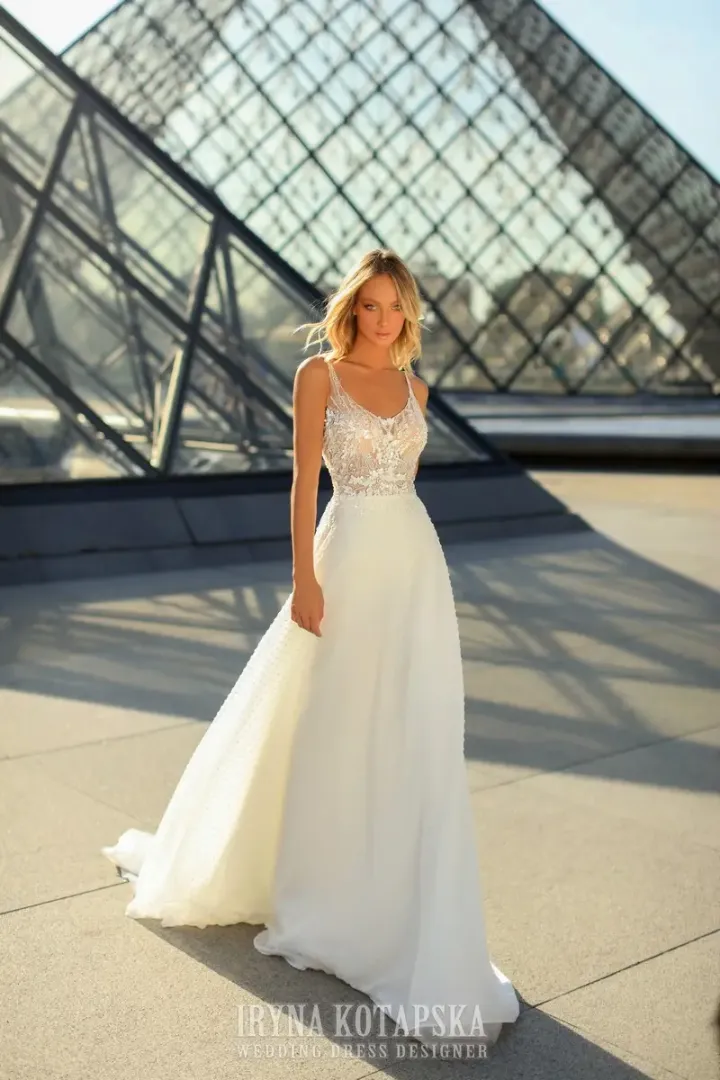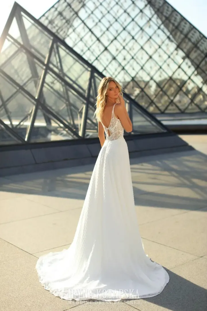 Ez a menyasszonyi ruha a könnyed elegancia és a nőies vonalak tökéletes ötvözete. Vékony pántos, alakot követő felsőrésze csipkével és flitterekkel díszített, finoman csillogva a fényben. A szoknya anyaga pöttyös muszlin, amely játékos, romantikus hangulatot kölcsönöz, miközben a hosszú uszály fokozza az ünnepélyes és elegáns megjelenést. Egy tökéletes választás azoknak a menyasszonyoknak, akik a klasszikus vonalakat a modern részletekkel szeretnék kombinálni a nagy napra.