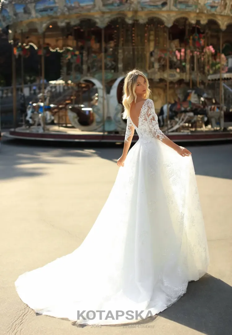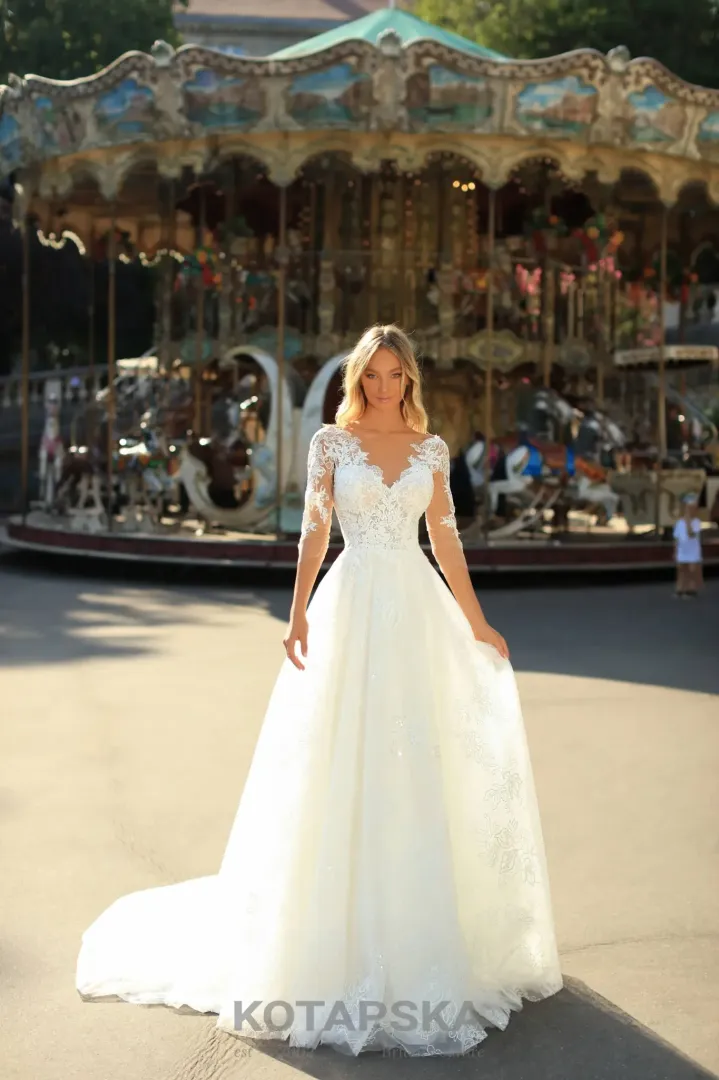 A ruha teljes hosszában gazdagon díszített különböző csipkefajtákkal, amelyek textúrát és eleganciát adnak az összhatásnak. A nagyszabású, bő szoknya és az uszály romantikus, ünnepi hangulatot teremt, így a menyasszony minden pillanatban csodálatosan fest az esküvőn. Ez a modell ideális választás templomi, polgári vagy szabadtéri esküvőkhöz, ahol a klasszikus stílus és a romantikus részletek tökéletes harmóniában találkoznak.