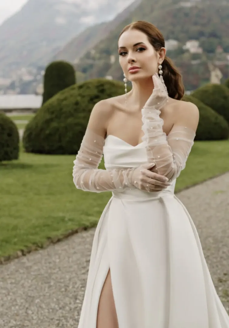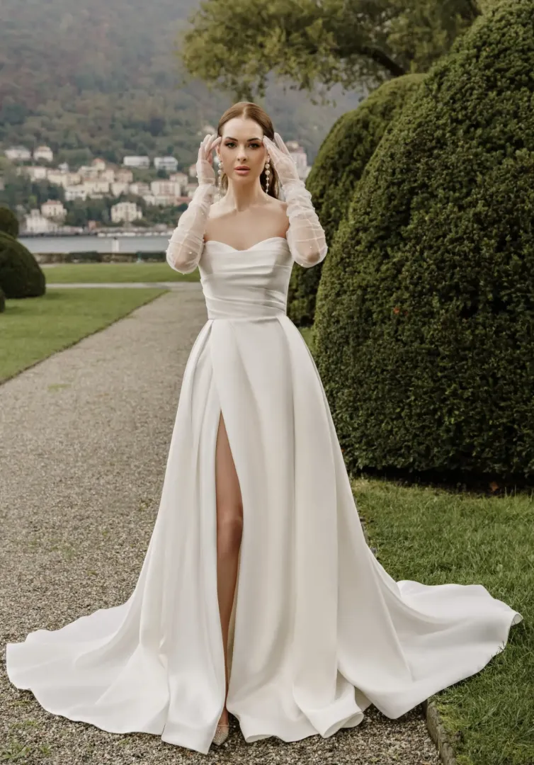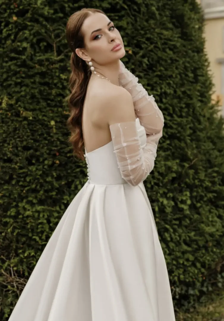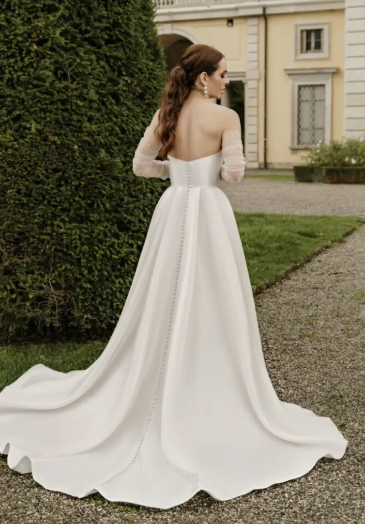 A 2325 menyasszonyi ruha a letisztult luxus és az időtlen elegancia megtestesítője. A magas minőségű mikado anyagból készült, amely gyönyörű tartást és elegáns fényt kölcsönöz a ruhának. A vállpánt nélküli felsőrész finom, precízen elhelyezett hajtásokkal díszített, így kiemeli a nyakat és a váll vonalát, miközben nőies és kifinomult hatást kelt.