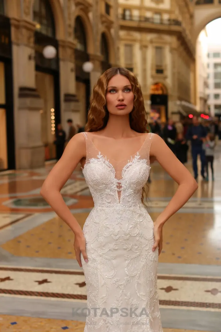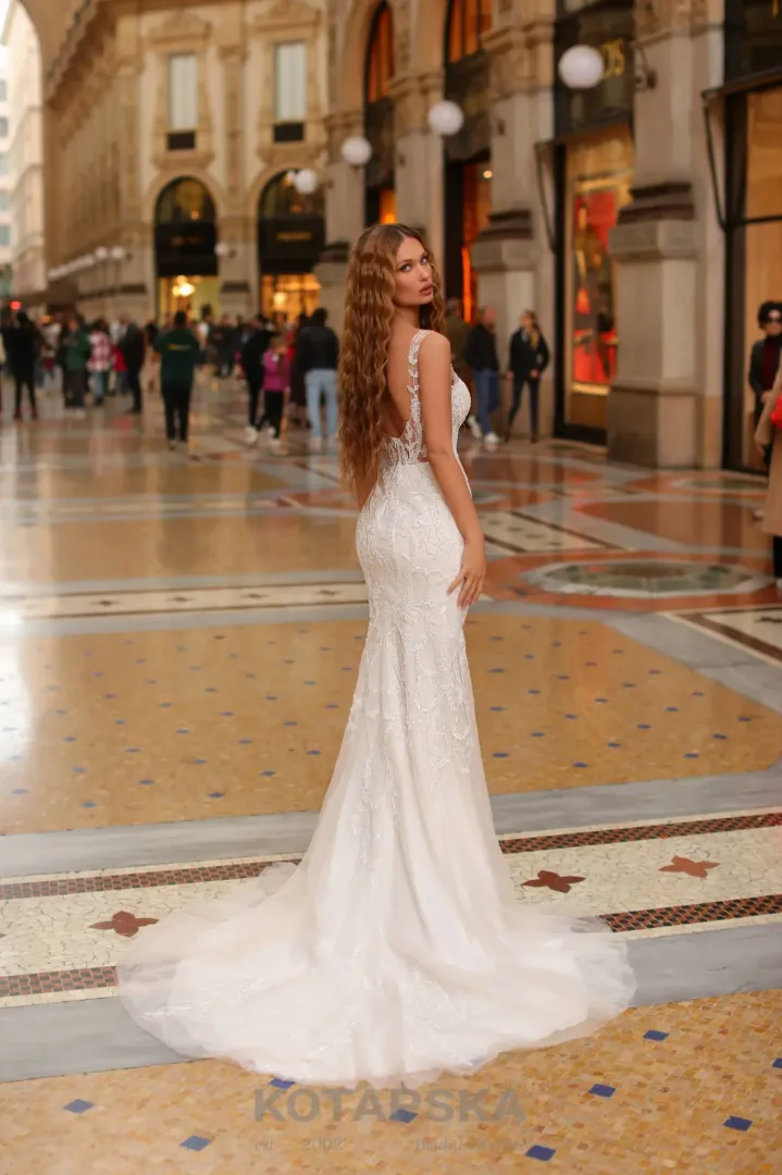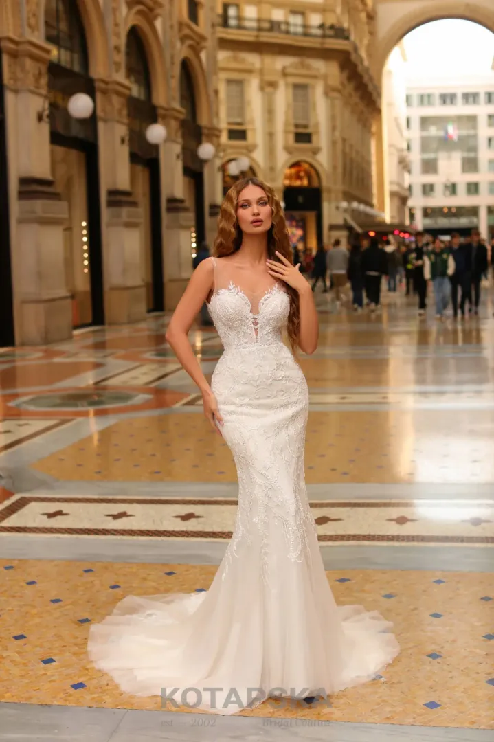 Ez a sellő fazonú menyasszonyi ruha a kifinomult elegancia megtestesítője. Teljes hosszában csipkével és csillogó kristályokkal díszített, így minden részletében ragyogó és káprázatos hatást kelt. A hosszú uszály fokozza a menyasszonyi megjelenés fényűző, ünnepélyes jellegét, miközben a ruha alakot követő szabása kiemeli a viselője vonalait. Egy tökéletes választás azoknak, akik klasszikus stílust és lenyűgöző, sellő fazonú eleganciát keresnek a nagy napra.