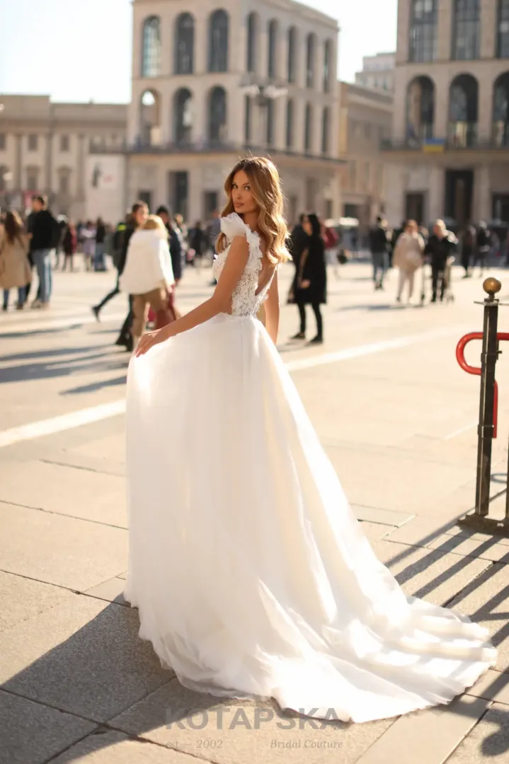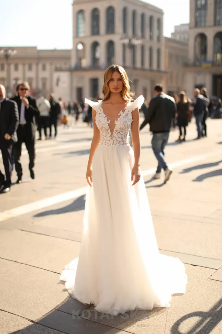 Ez a menyasszonyi ruha a romantika és az éteri elegancia tökéletes megtestesítője. A V dekoltázs hangsúlyozza a nőies vonalakat, míg a felsőrészt díszítő 3D virágapplikációk különleges textúrát és romantikus részleteket adnak a ruhához. A vállrészt finom tüllből tervezték, amely szinte angyalszárnyra emlékeztet, kiemelve a menyasszony légies megjelenését. A szoknya lágy tüllből készült, fél méteres uszállyal, amely ünnepélyes, mégis könnyed mozgást biztosít minden lépésnél. Ez a ruha ideális választás azoknak a menyasszonyoknak, akik szeretnének a nagy napon egy igazán különleges, romantikus és éteri megjelenést.