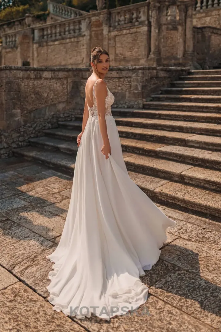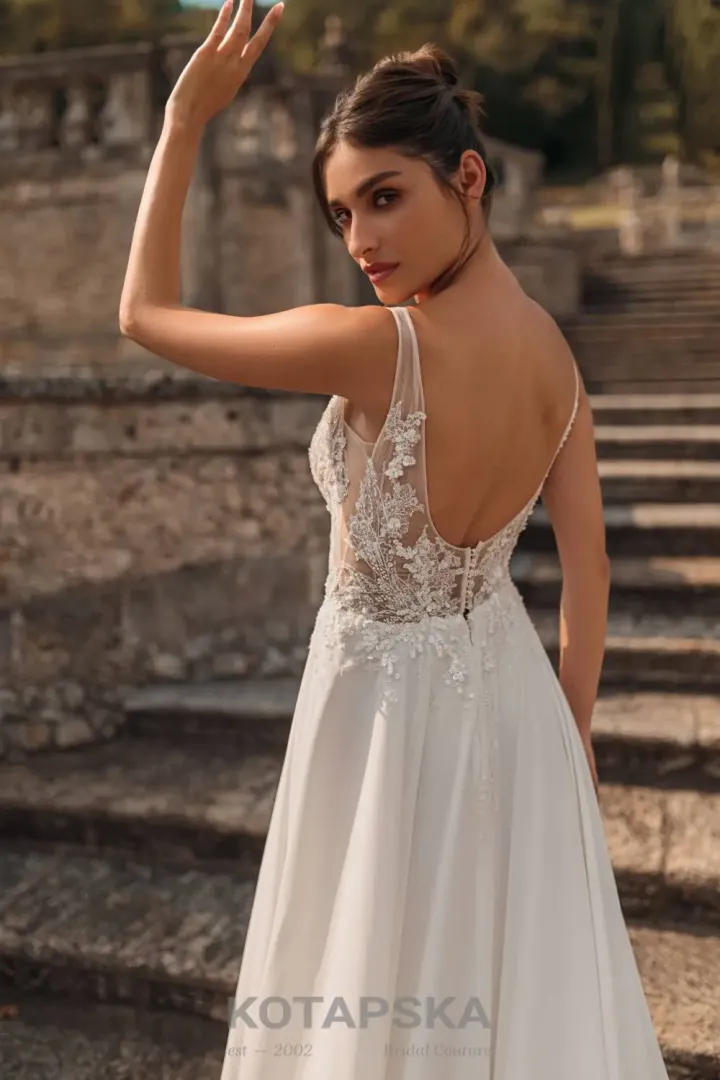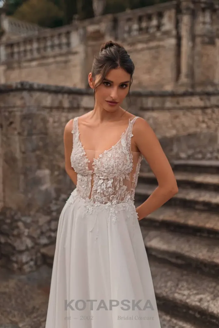 Ez a tüll menyasszonyi ruha könnyed és légies megjelenésével azonnal magára vonja a figyelmet. A ruha felsőrésze eredeti, finom csipkéből készült, amely egyedi romantikus részleteket kölcsönöz a megjelenésnek. Az anyag levegős textúrája könnyedséget ad minden lépéshez, így a menyasszony szinte lebeg a nagy napon. A csipke finom kidolgozása és az összhatás eleganciája a ruhát különlegessé teszi, megteremtve a tökéletes kombinációt a romantika és a kifinomultság között. Ideális választás minden menyasszonynak, aki egy könnyed, mégis emlékezetes ruhában szeretné kimondani az igent.