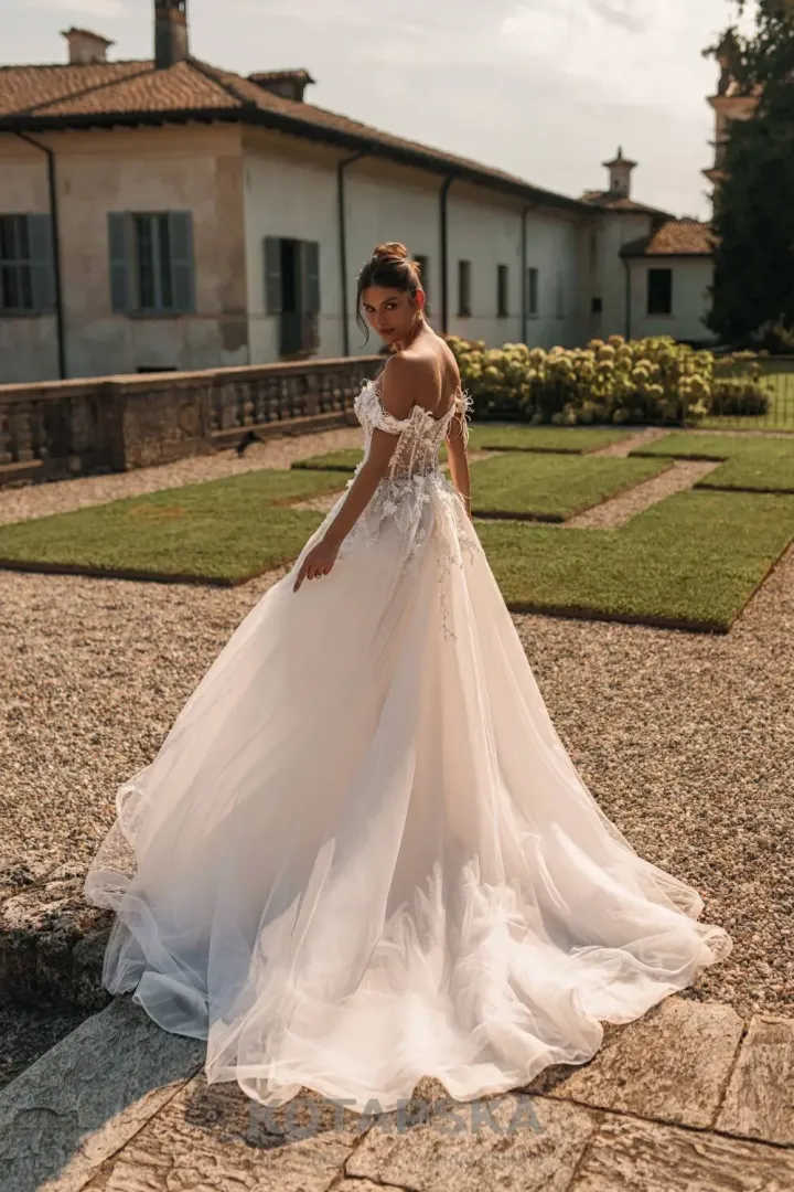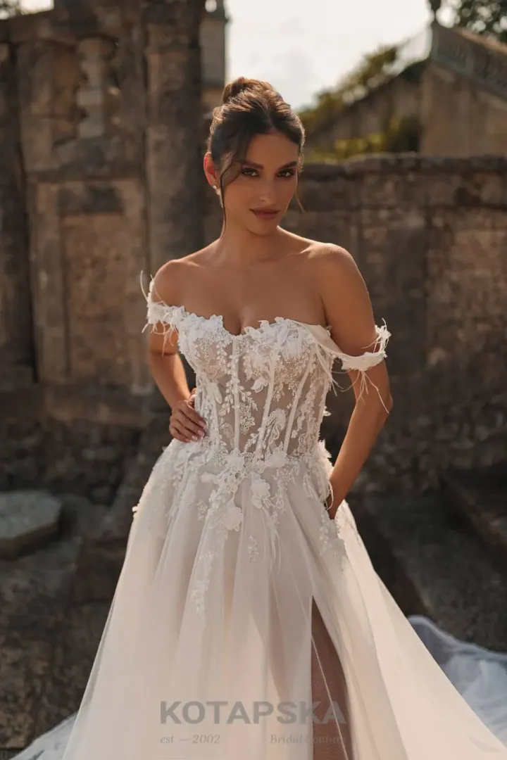A Kotapska 2631 menyasszonyi ruha különleges és igazán luxus megjelenést biztosít minden menyasszonynak, aki szeretne felejthetetlen hatást kelteni. A felsőrész gazdagon díszített csipkével, virág applikációkkal és finom marabú tollakkal, amelyek könnyedséget, romantikát és exkluzív hangulatot kölcsönöznek a ruhának.