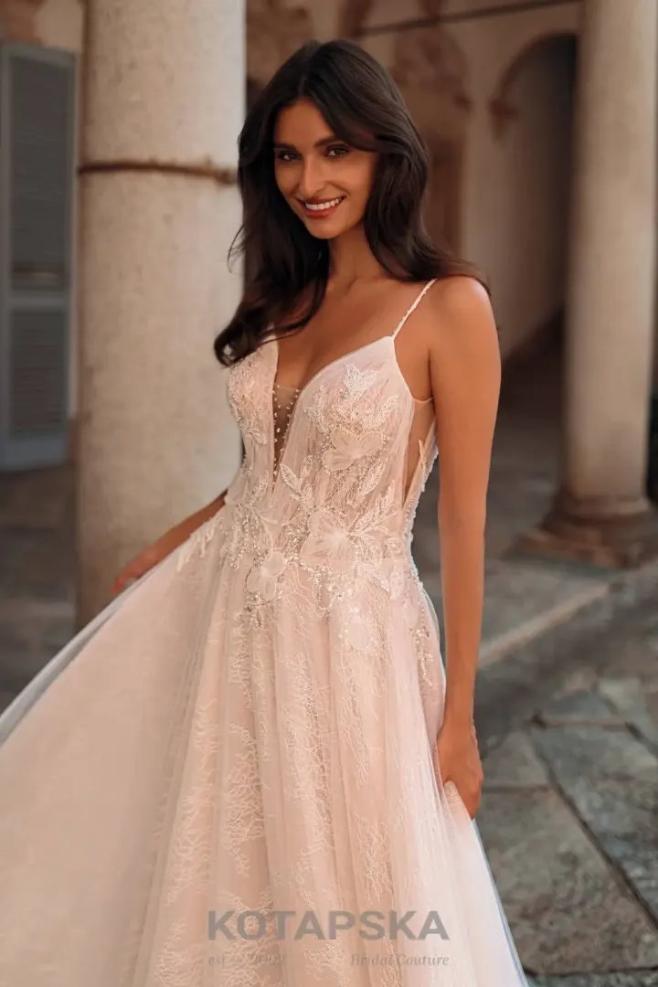 A 2635 menyasszonyi ruha tökéletes választás azoknak a menyasszonyoknak, akik a klasszikus eleganciát modern részletekkel szeretnék ötvözni. A felsőrészt díszítő finom hajtások és a francia Chantilly csipke aprólékos mintázata káprázatos összhangban van a virág rátétekkel, így igazán kifinomult és romantikus hatást kelt. A pántokat és a V kivágású dekoltázst hímzés emeli ki, amely különleges, kézműves részletként teszi egyedivé a modellt. A szoknya több rétegű, lágy tüllből készült, elegánsan követi a mozdulatokat, miközben nem tartalmaz csipke réteget, így a ruha megőrzi könnyed, légies megjelenését. Uszály nélküli kialakítása miatt praktikus, kényelmes és ideális akár polgári, akár templomi esküvőre.