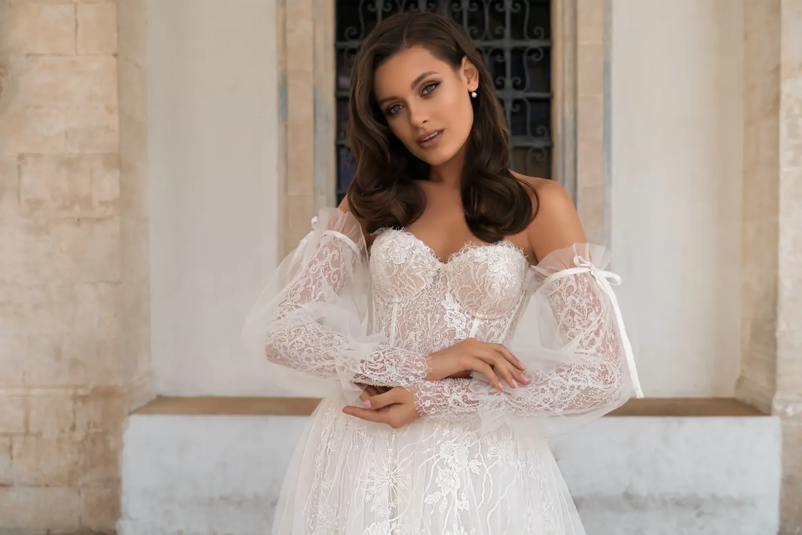 levehető ujjú menyasszonyi ruha