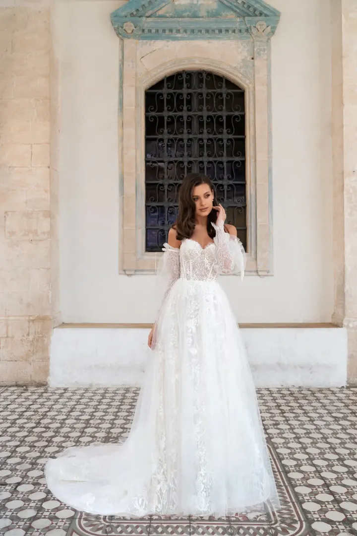 Az Abby menyasszonyi ruha a klasszikus csipke időtlen szépségét ötvözi a modern kényelemmel. A teljes egészében csipkéből készült modell felső része fűzős kialakítású, amely kiemeli a derekat és finoman formálja az alakot. A szoknyát könnyed, áttetsző tüllréteg fedi, amely légies mozgást és bájos könnyedséget ad a megjelenésnek. A ruha különlegessége a levehető tüll- és csipkeujj, amely romantikus hangulatot varázsol, ugyanakkor lehetőséget ad a menyasszonynak, hogy a nap folyamán változtasson a megjelenésén. Az uszály nélküli szabás modern és praktikus, így az Abby ruha ideális választás azoknak, akik elegáns, romantikus, de kényelmes darabra vágynak a nagy napra.