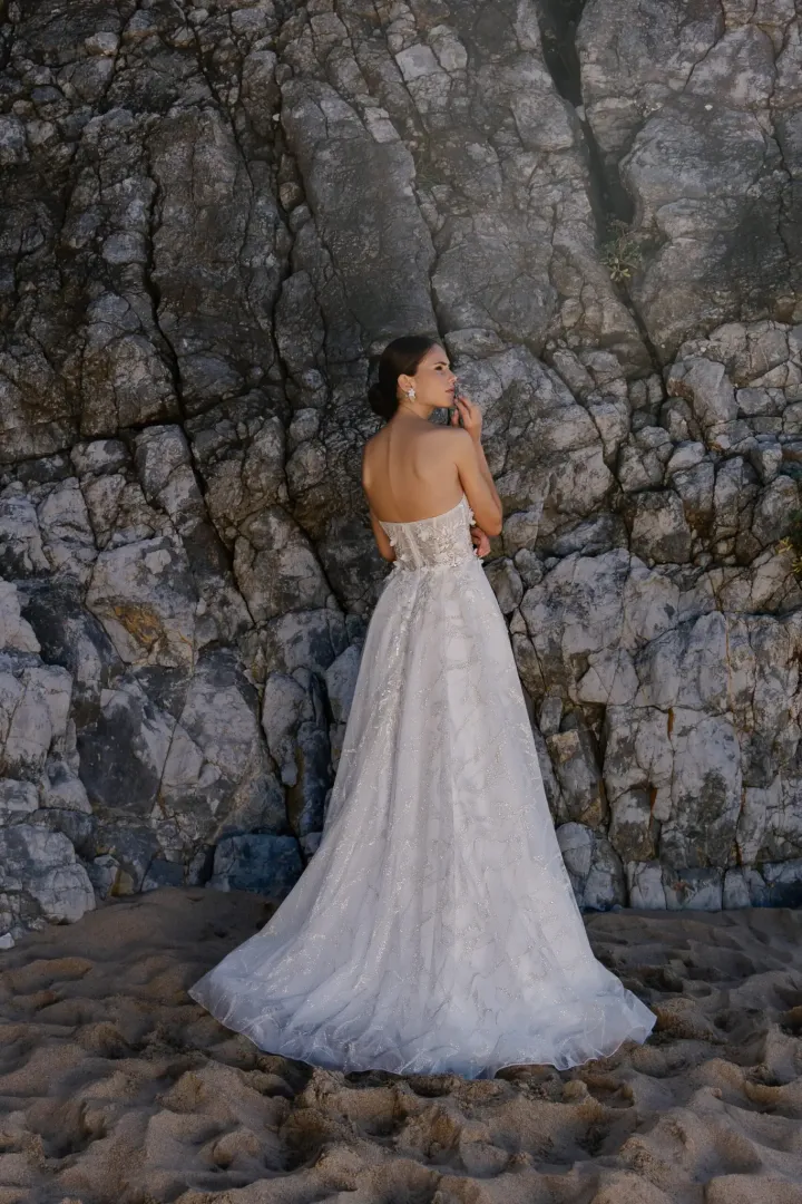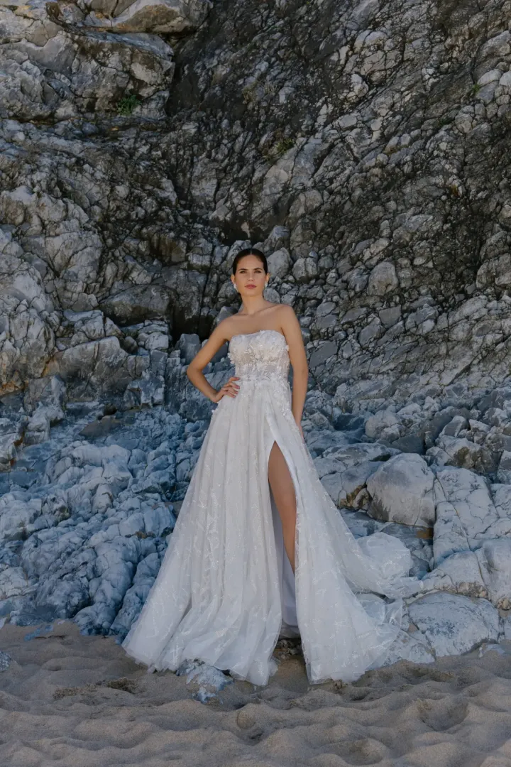Az Andrea M 01 A-vonalú menyasszonyi ruha igazi álom a nagy napra. A felsőrészt nyitott nyakkivágással, finom 3D csipkével és zipzáras záródással tervezték, ami egyszerre elegáns és kényelmes viseletet biztosít. A bő szabású, levehető ujjak különleges látványt nyújtanak, míg a szoknyát bal oldali elegáns slicc teszi izgalmassá és modernné. A 0,5 méteres uszály romantikus és kifinomult kiegészítést ad az összhatásnak, így minden menyasszony hercegnőnek érezheti magát a nagy napon.