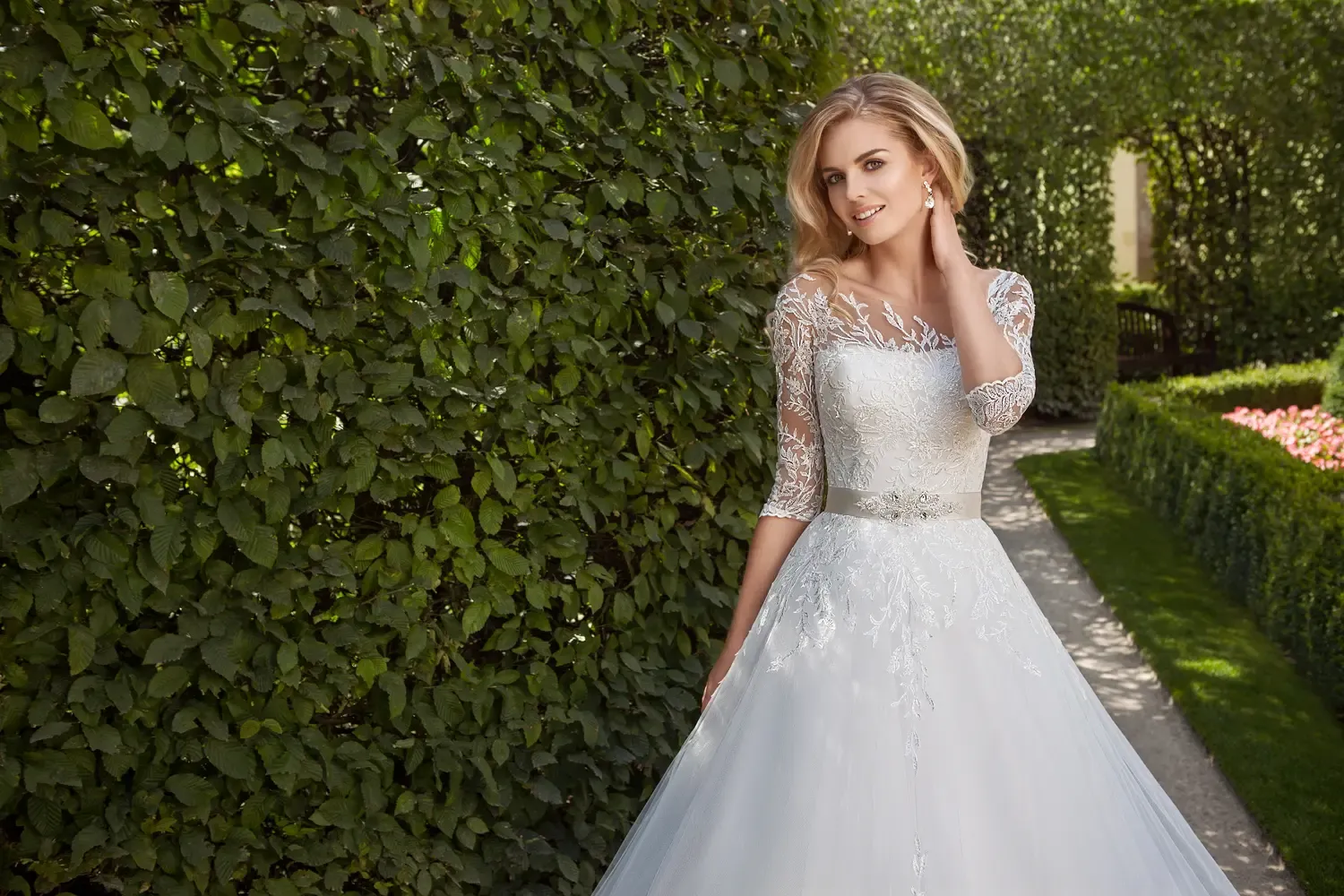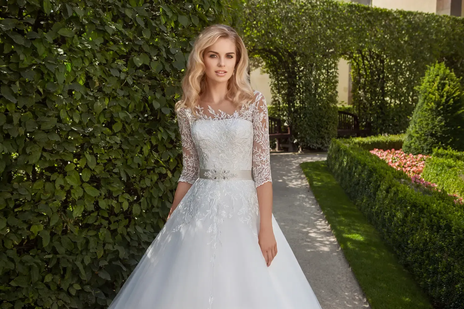A ruha Chantilly csipkéből készült, melynek finom mintázata romantikus és légies megjelenést biztosít. A háromnegyedes ujjak és a felső részen alkalmazott illúzió tüllre varrt csipke elegánsan sejteti a bőrt anélkül, hogy túlzottan kivágott lenne.