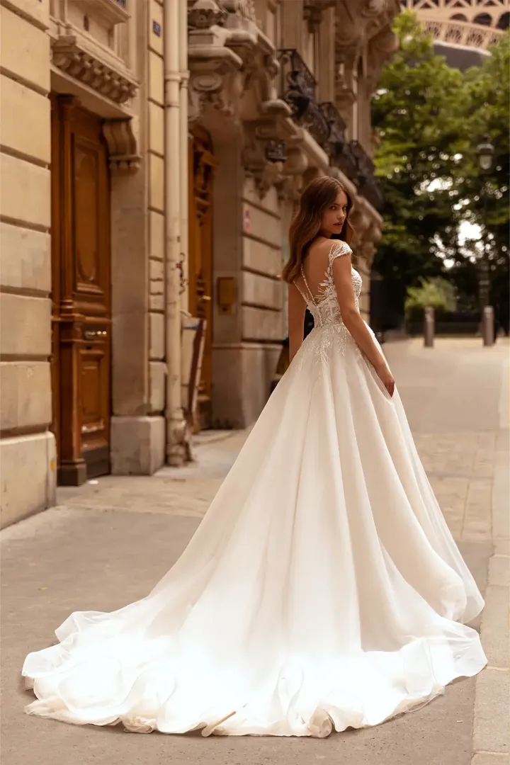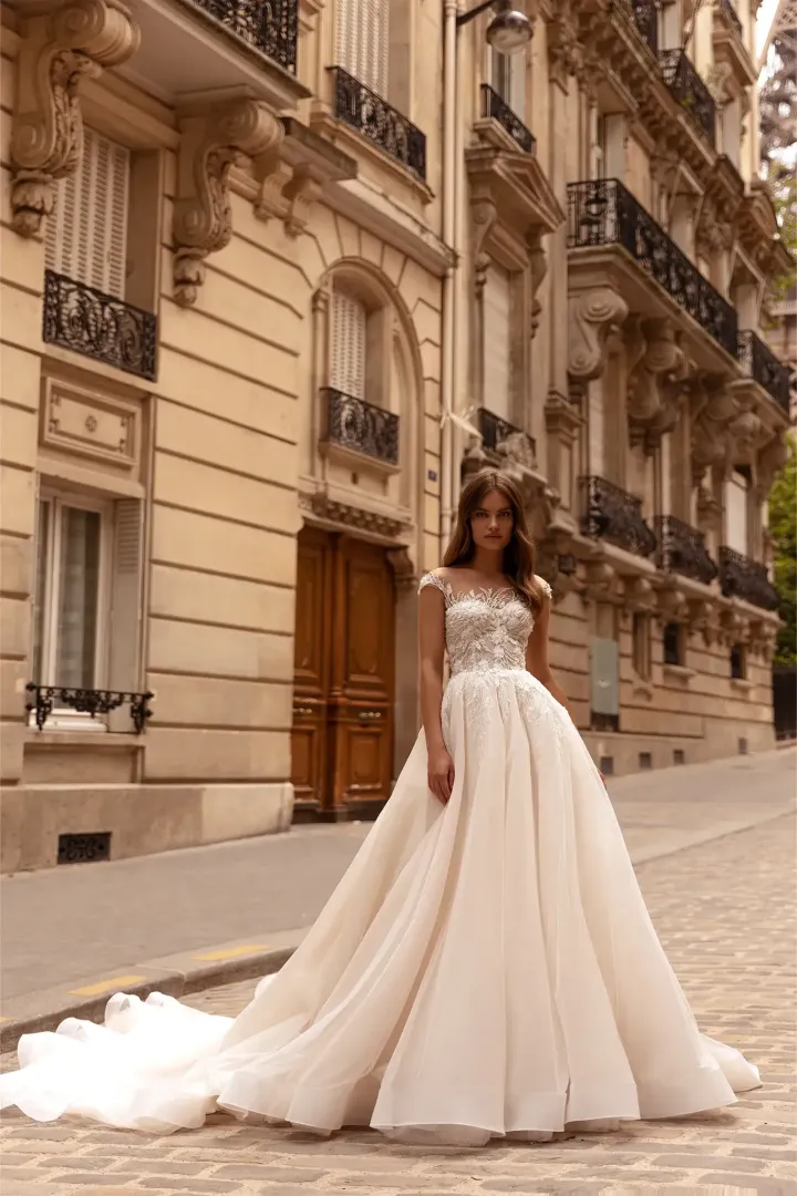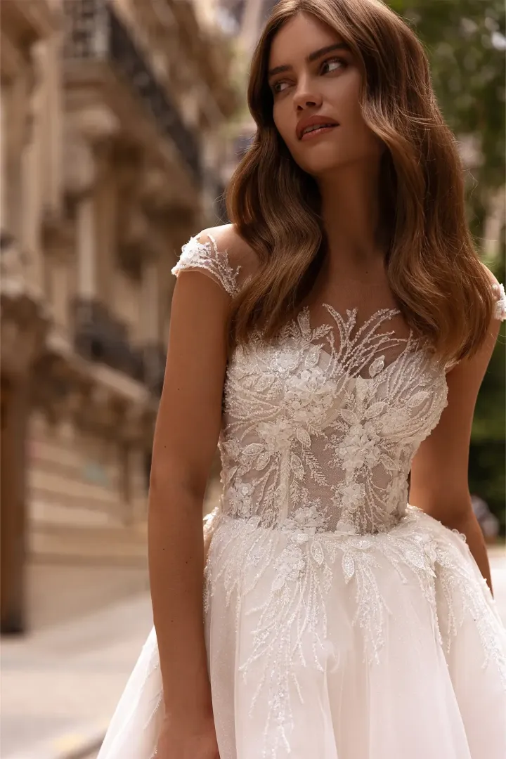 A Citrine menyasszonyi ruha a kifinomult elegancia és a látványos részletek megtestesítője. A felsőrész különlegességét a gyöngyös virágapplikációk adják, amelyek finoman díszítik a csillámos hálóra szabott fűzőszerű fazont. Az áttetsző halcsontozas és a formázott kosarak modern és érzéki megjelenést kölcsönöznek, míg a hátvonal gombos-cipzáras megoldása elegáns lezárást biztosít. A szoknya csillámos tüllrétegei könnyed mozgással követik a menyasszony minden lépését. A szegély lószőr zsinórral van díszítve, amely finom tartást és drámai hatást ad a ruha teljes megjelenésének. Ez a ruha azoknak a menyasszonyoknak készült, akik egyszerre vágynak a romantikus bájra és a lehengerlő, emlékezetes belépőre.