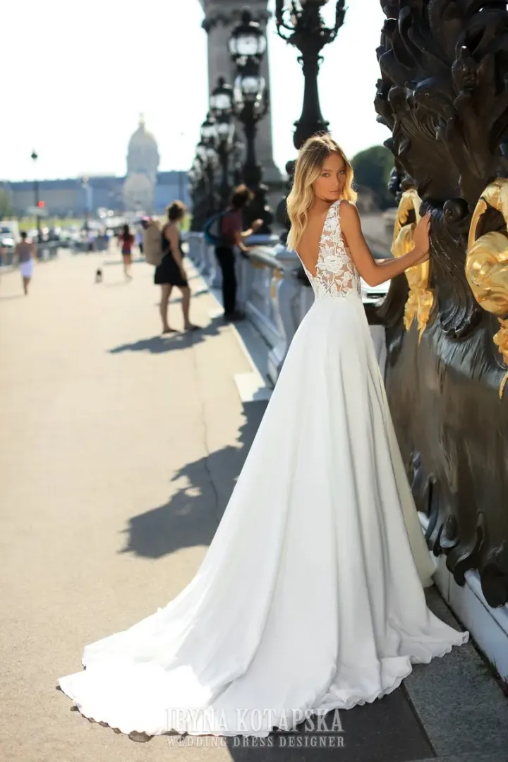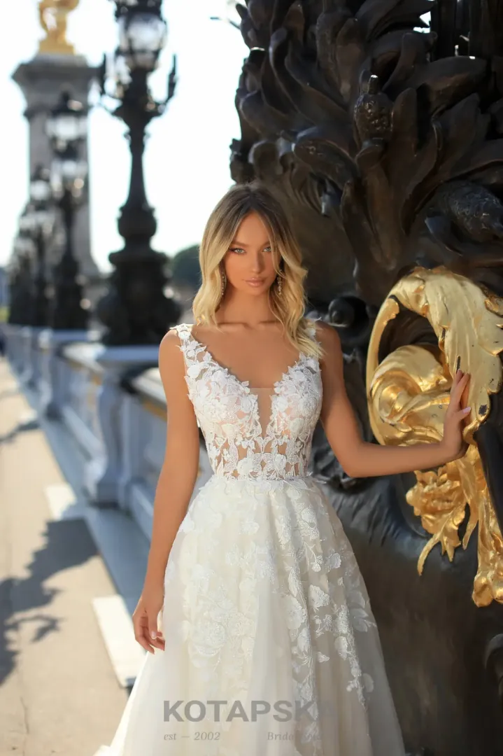 A 2314-es menyasszonyi ruha a modern menyasszonyok kreativitását és eleganciáját ötvözi. V-nyakú, csipkével díszített felsőrésze finoman emeli ki a nőies vonalakat, míg az oldalt futó illúziós tüll betét légies, romantikus hatást kölcsönöz. A ruha különlegessége a kétfunkciós kialakítás: az alapot képező muszlin szoknyás ruhára patentokkal felhelyezhető egy gazdagon díszített tüll szoknya, így a menyasszony a nap folyamán könnyedén változtathatja a megjelenését. Ez a modell ideális választás azoknak, akik eleganciát, kreativitást és sokoldalúságot keresnek esküvőjükre.