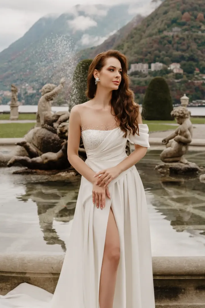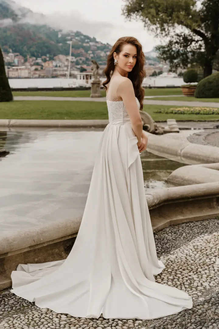 A Melrose 2319-es sellő fazonú menyasszonyi ruha elegáns és modern megjelenést kínál. Szatén anyagból készült, amely tökéletesen kiemeli a test vonalait, míg az aszimmetrikus ujj különleges, stílusos részletet ad. A szoknya uszályos, elöl sliccelt kialakítású, így mozgás közben izgalmas látványt nyújt. Az illúzió tüll felsőrészen kristályokkal díszített pontok ragyogó csillogást adnak a ruhának, tökéletes választás azoknak a menyasszonyoknak, akik szeretnék ötvözni a klasszikus eleganciát a modern, különleges részletekkel.