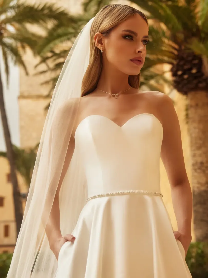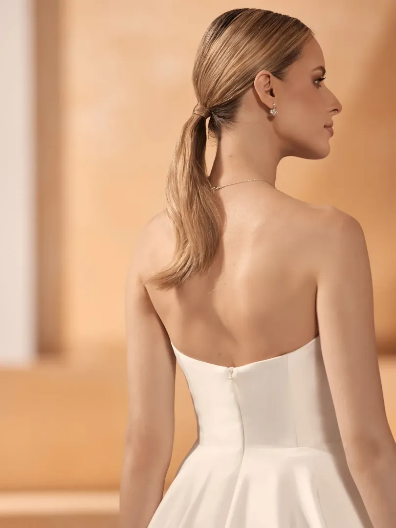 A ruha egyszerre elegáns, letisztult és időtlen – tökéletes választás kifinomult menyasszonyoknak.