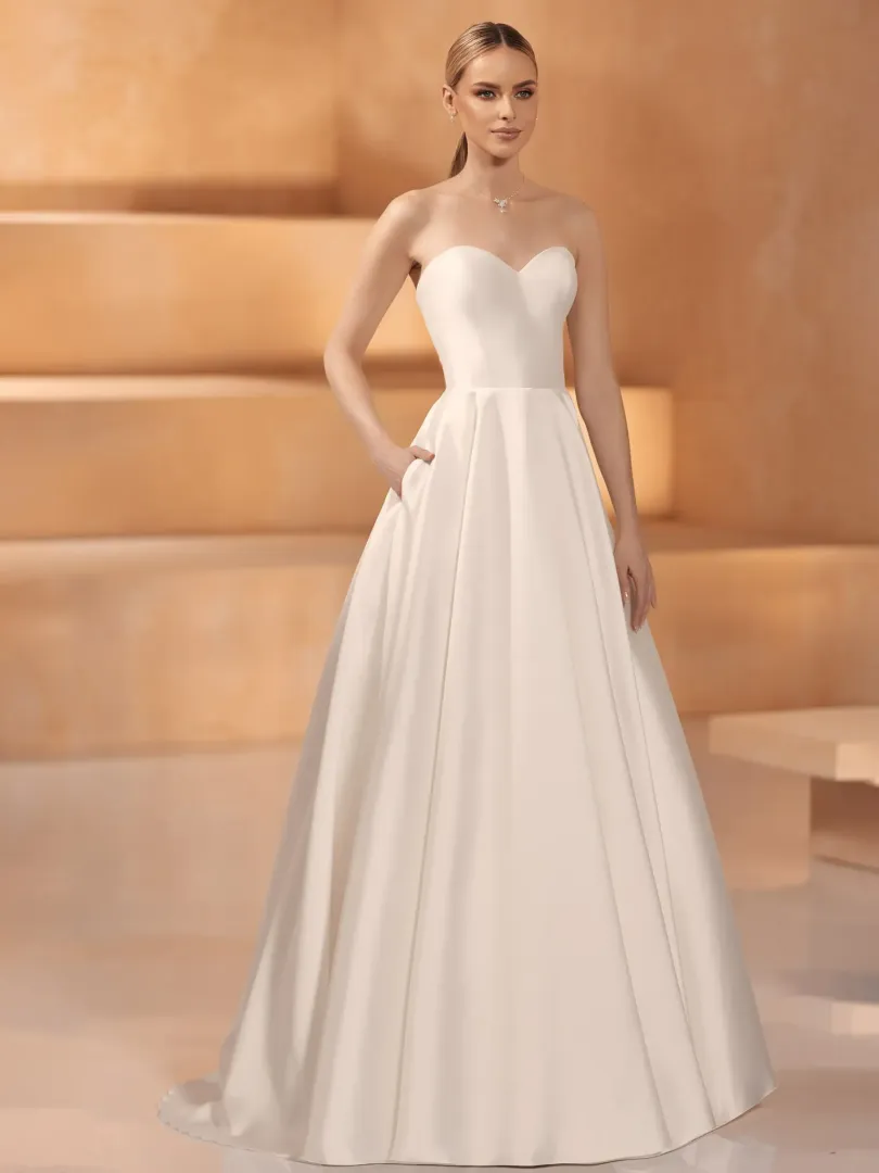 Az Olga menyasszonyi ruha a klasszikus elegancia és a modern letisztultság tökéletes találkozása. Mikádó anyagból készült, amely gyönyörű tartást és fényűző megjelenést kölcsönöz a ruhának.