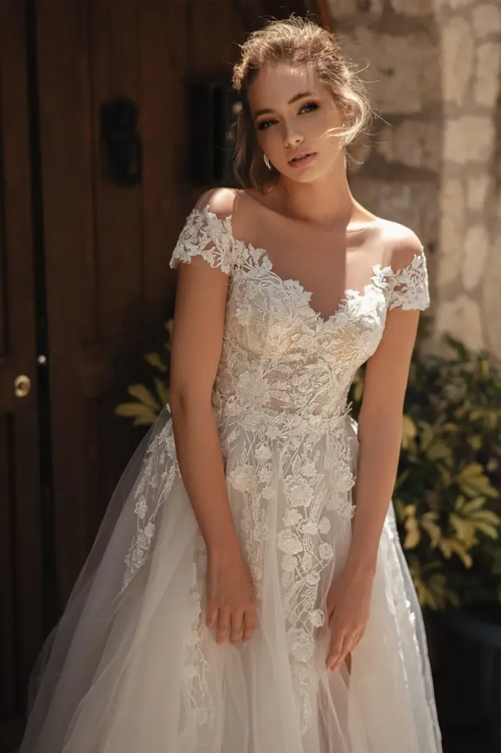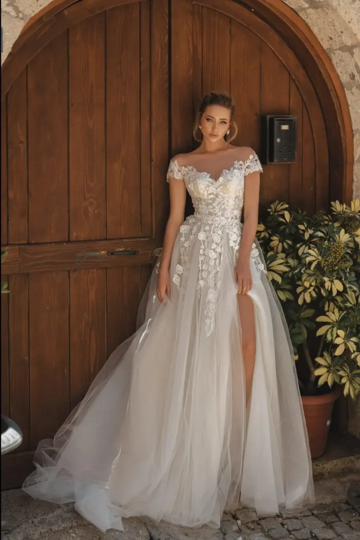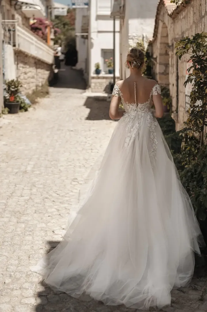 Ez a menyasszonyi ruha a kifinomult elegancia és a modern részletek harmonikus ötvözete. Gazdagon csipkézett felsőrésze különleges karaktert kölcsönöz, míg a szoknya elől sliccelt kialakítása könnyed mozgást és vonzó megjelenést biztosít. A ruha hátul cipzárral és ékszer gombokkal záródik, ami finom luxus érzetet ad. A könnyű uszály romantikus bájt kölcsönöz, így ez a modell ideális választás azoknak a menyasszonyoknak, akik szeretnék ötvözni a klasszikus szépséget a modern stílusjegyekkel.