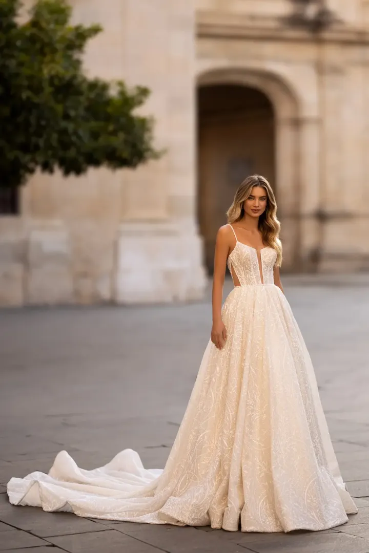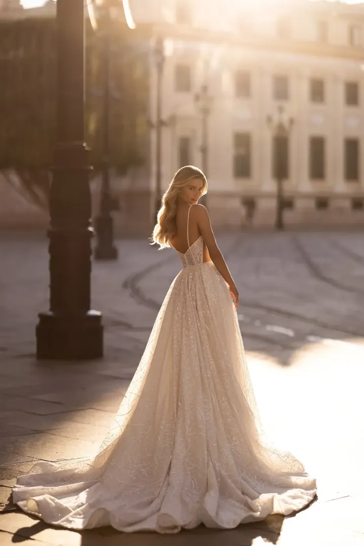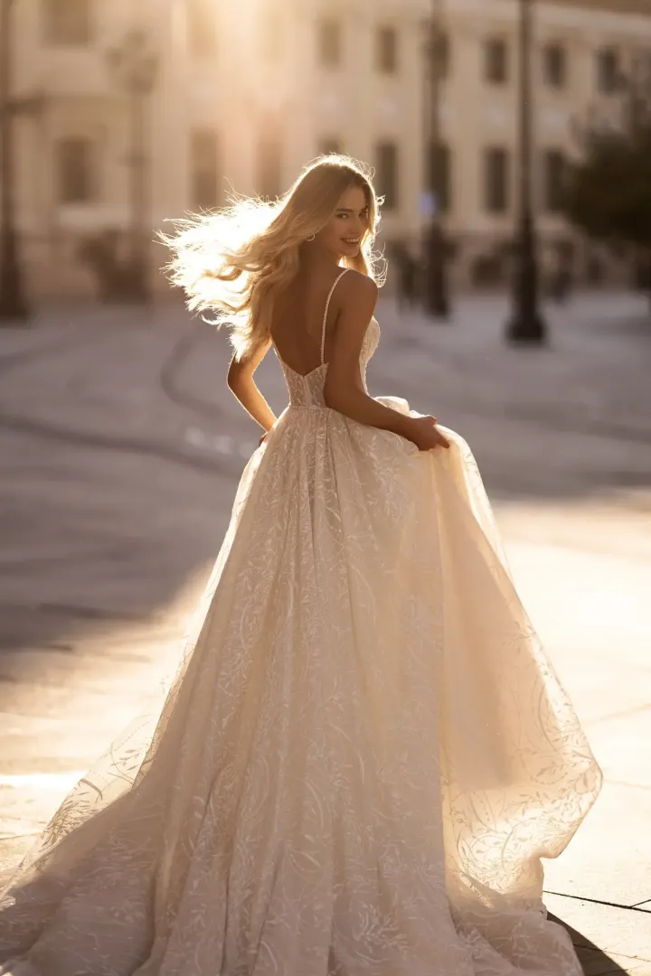 A Rada menyasszonyi ruha igazi ékszerdarab, amely a csillogás és a romantikus részletek tökéletes harmóniáját kínálja. Az A-vonalú sziluett könnyed eleganciát sugároz, miközben a mély kivágású felsőrész és az illúziós oldalpanelek kiemelik a női alakot. A vékony pántokat kristályok és gyöngyök díszítik, amelyek finoman futnak végig a vállon, majd a hátul mély V-kivágásban találkoznak. A derékvonal gyöngyös és kristályos díszítése még több csillogást ad a megjelenéshez, míg a virágmintás csillámos tüll romantikus és modern hatást kölcsönöz. Ez a ruha azok számára készült, akik szeretnék, ha esküvői napjukon minden tekintet rájuk szegeződne, eleganciát és ragyogást sugározva.