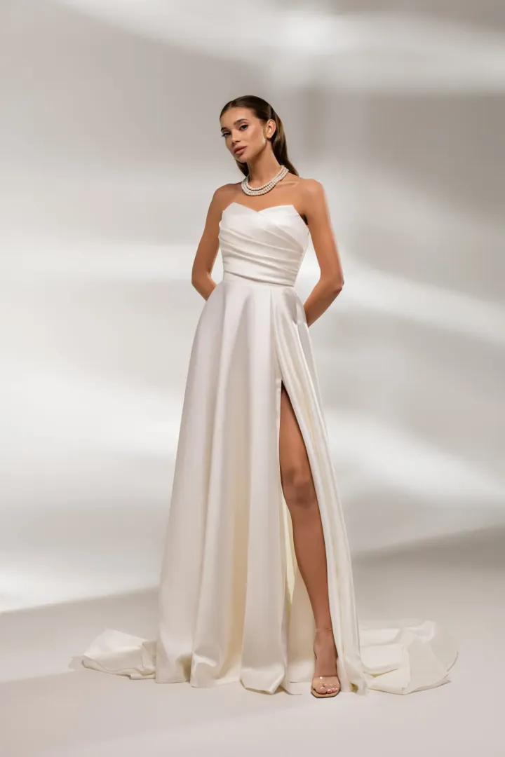 A Ray 2431 A-vonalú menyasszonyi ruha a modern elegancia és a klasszikus letisztultság találkozása. Magas minőségű mikado anyagból készült, amely tartást és kifinomult fényt biztosít a modellnek. A drapírozott felsőrész különleges részletként emeli ki a ruha egyediségét, míg a nyitott hát nőies és vonzó megjelenést kölcsönöz. A szoknya mély slicce könnyedséget és játékosságot ad a megjelenéshez, miközben megőrzi az elegáns összhatást. Egy igazán különleges választás a menyasszonyok számára, akik a visszafogott luxust kedvelik.