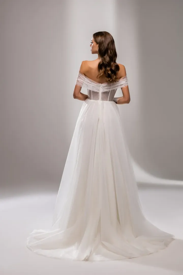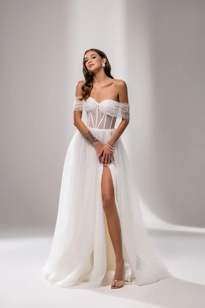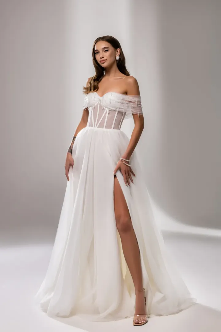 A szoknya elöl sliccelt megoldása modern és izgalmas részlet, amely lendületesebbé és könnyedebbé teszi a megjelenést. Ez a ruha ideális választás azok számára, akik egy ragyogó, stílusos és önbizalommal teli outfitben szeretnék kimondani az igent.
