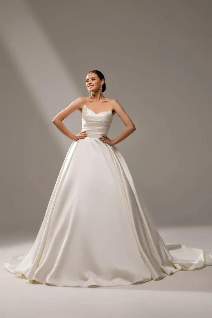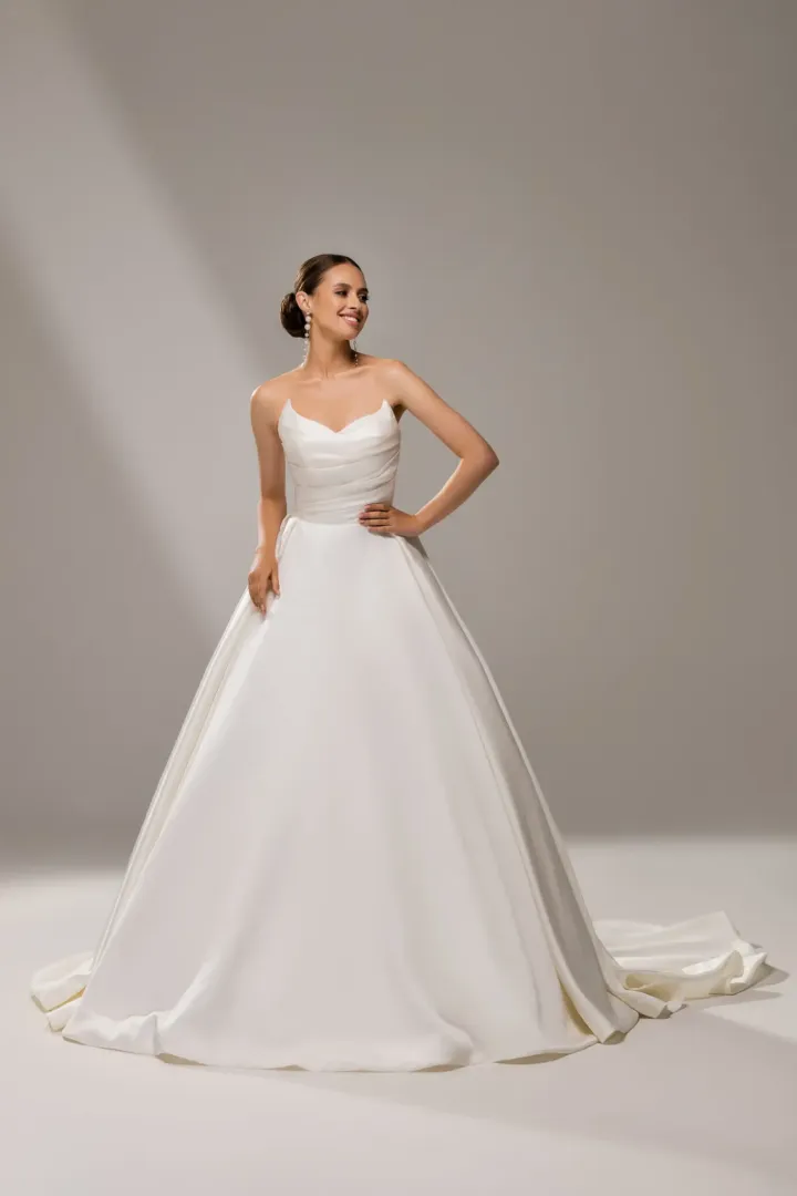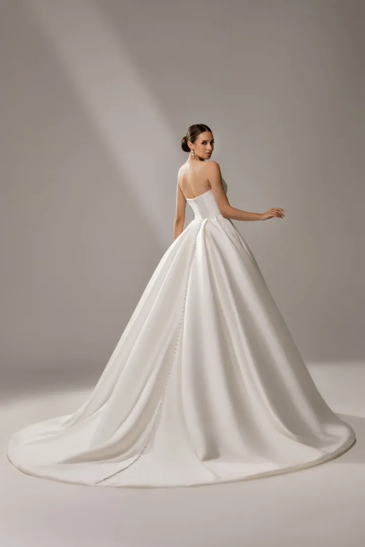 Az SP2430 menyasszonyi ruha a letisztult elegancia megtestesítője. Kiváló minőségű mikádó anyagból készült, amely tartást, fényt és exkluzív megjelenést biztosít. A ruha vállpánt nélküli kialakításának köszönhetően gyönyörűen hangsúlyozza a dekoltázst és a vállakat.