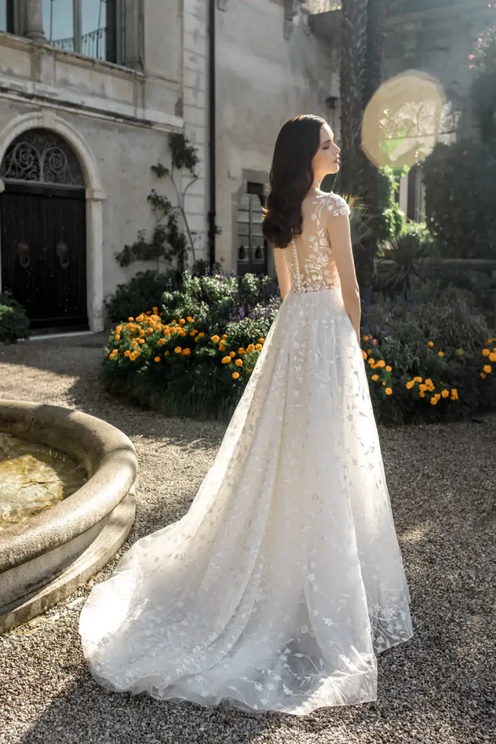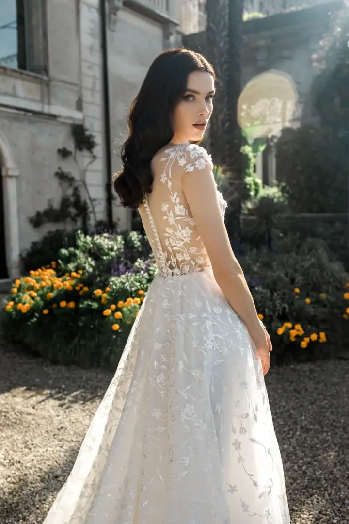 A Vanessa menyasszonyi ruha a romantikus elegancia és a modern könnyedség tökéletes kombinációja. A felsőrészt illúziós tüllből készült levél mintájú csipkerátétek díszítik, és ejtett vállai finoman keretezik a vállakat, miközben a hátoldalon ékszergombokkal záródik, kifinomult lezárást biztosítva. Az A-vonalú szoknya két rétegből áll: a felső, lágy tüllréteg könnyed és légies hatást kölcsönöz, míg az alsó csipkeréteg textúrát és eleganciát ad az egész megjelenéshez. A ruha uszály nélküli kialakítása praktikus és kényelmes, ugyanakkor a teljes hosszú csipkedíszítés romantikus és nőies hatást kelt, ideális választás azoknak a menyasszonyoknak, akik modern, mégis klasszikus stílusban szeretnék kimondani az igent.