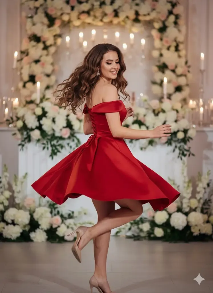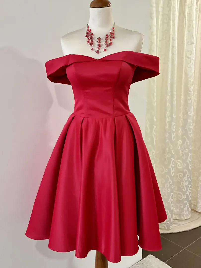A Piroska menyecske ruha a klasszikus piros szín és a nőies vonalvezetés tökéletes találkozása. A finoman fénylő piros szatén elegáns, mégis játékos összhatást kelt, az ejtett váll pedig lágyan keretezi a dekoltázst.