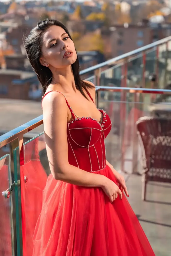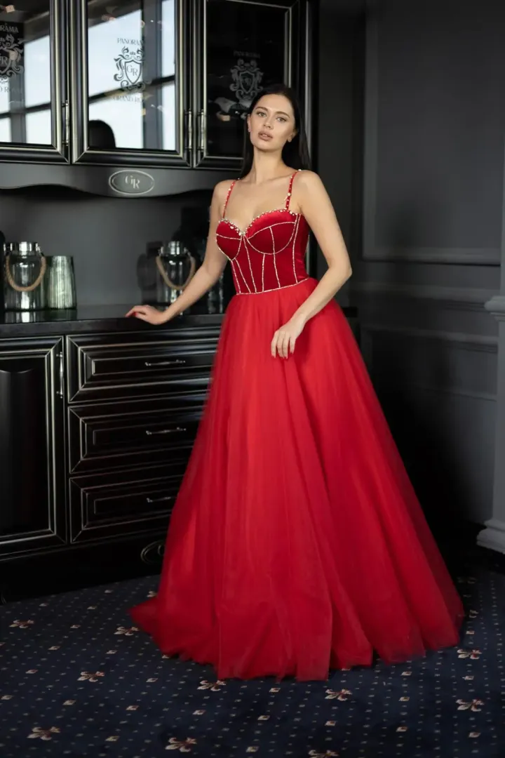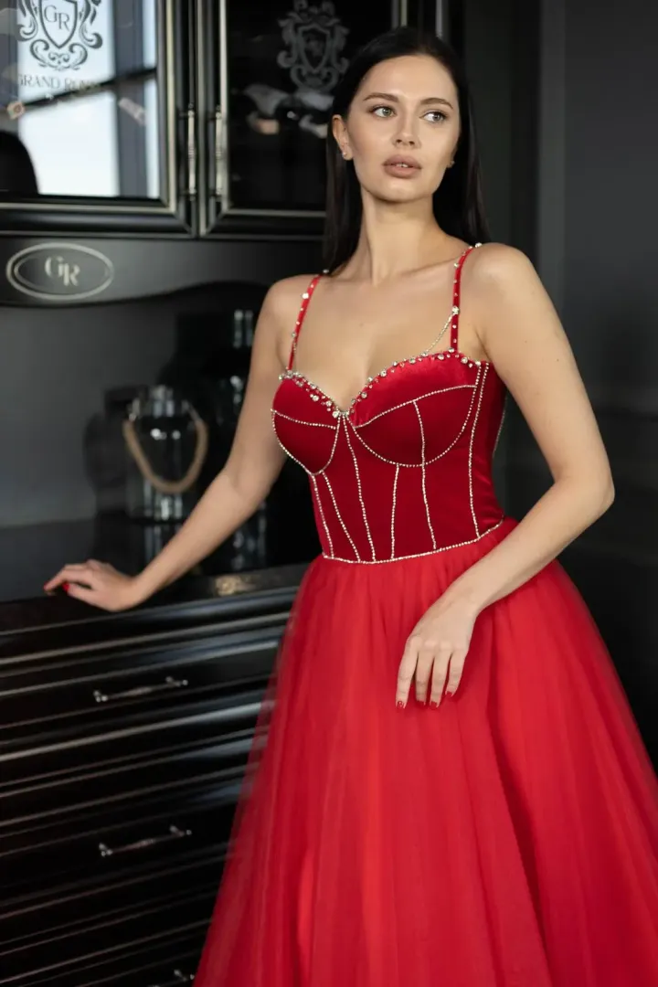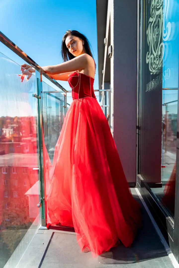 A Scarlet menyecske ruha a klasszikus elegancia és a magabiztos nőiesség tökéletes kombinációja. A korzettes felsőrész puha, fényűző piros bársonyból készült, amely gyönyörűen kiemeli a felsőtestet és ünnepélyes megjelenést kölcsönöz. A strasszos ék díszítés finom csillogást ad, még különlegesebbé téve a felsőrészt. A hátul fűzővel záródó kialakítás lehetővé teszi a tökéletes illeszkedést és az alak kiemelését.