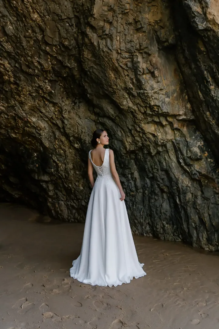 A Silvia M-02 menyasszonyi ruha azoknak a menyasszonyoknak készült, akik a letisztult eleganciát modern részletekkel szeretnék ötvözni. Az A-vonalú szabás minden testalkaton előnyösen mutat, miközben könnyed, légies megjelenést biztosít a nagy napon.