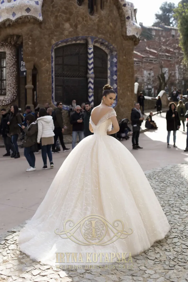 A nagy volumenű hercegnős tüll szoknyát flitterek teszik extra ragyogóvá, így a fények játékában minden lépés látványos és emlékezetes. A ruha cipzáras hátrésszel és uszály nélküli kialakítással készül, ami maximális kényelmet biztosít a tánc során is.