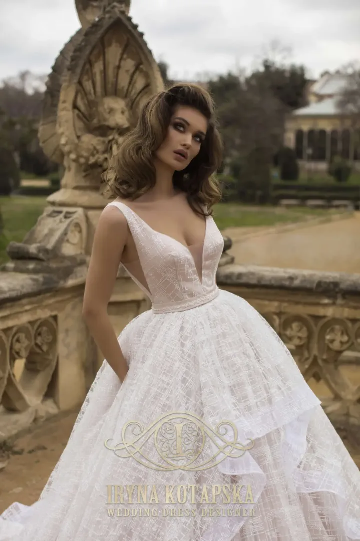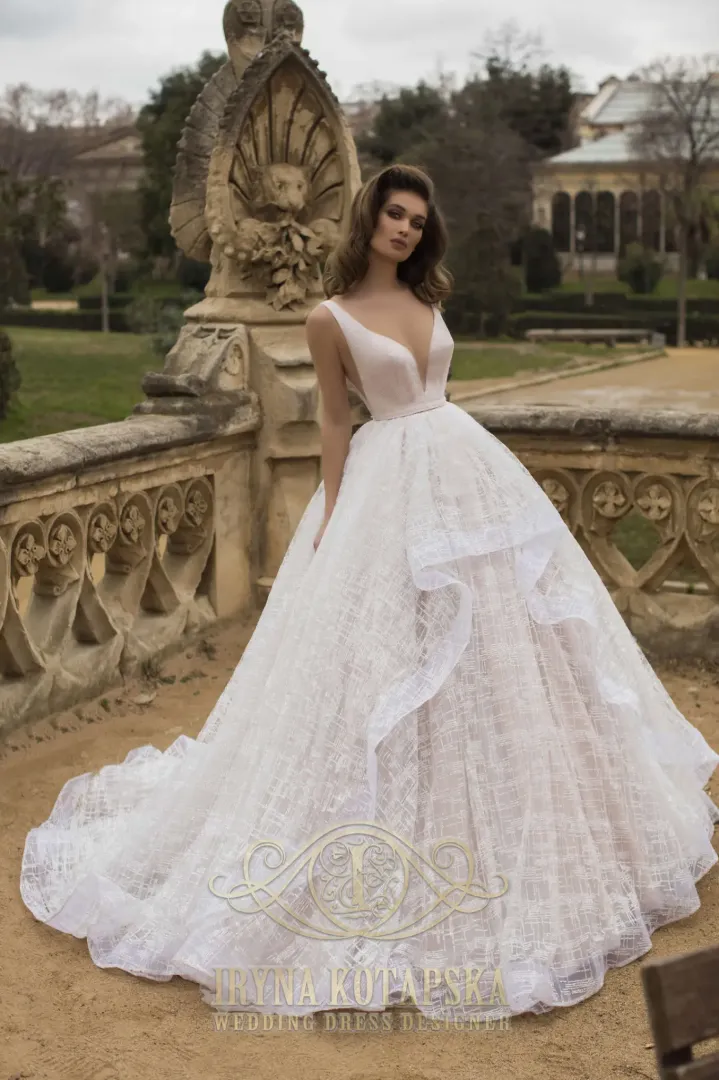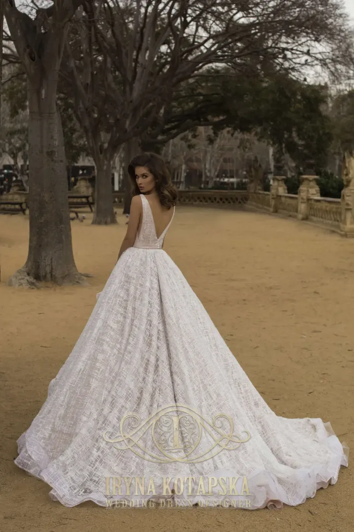 A V alakú dekoltázs és a kecses, csillogó pántok nőies és elegáns megjelenést nyújtanak, miközben nem vonják el a figyelmet a szoknya rész káprázatos díszítéséről. A derekat csillogó kristályöv hangsúlyozza, amely még karcsúbb sziluettet biztosít. A felsőrész illúzió tüll betétei optikailag tovább formálják az alakot.