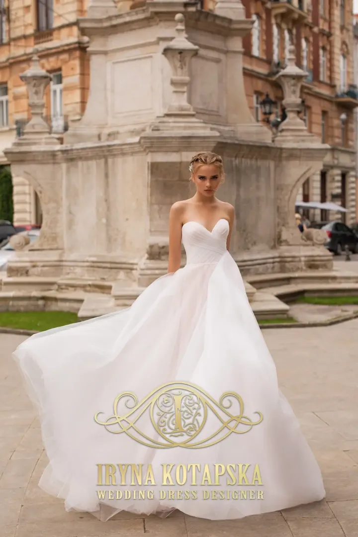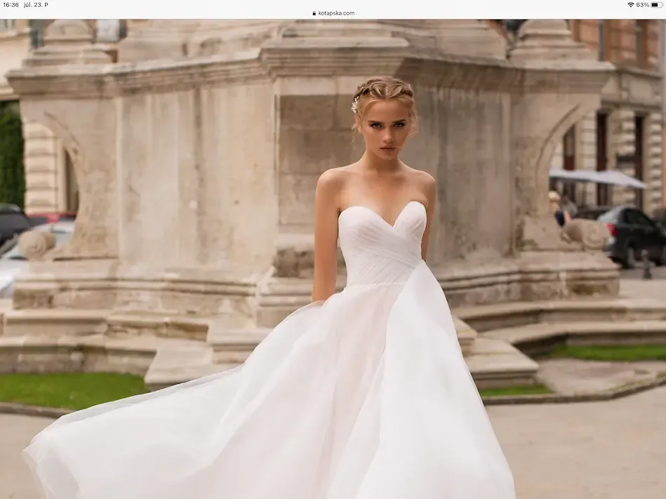 A 2012 keringőruha a letisztult stílus és a nőies részletek tökéletes harmóniáját kínálja. A korzettes felsőrészt finoman drapírozott tüll borítja, ami kiemeli a derékvonalat és elegánsan formálja az alakot. A pasztell rózsaszín bélés különleges árnyalatot kölcsönöz a törtfehér tüll szoknyának, így a ruha egyszerre romantikus és modern.