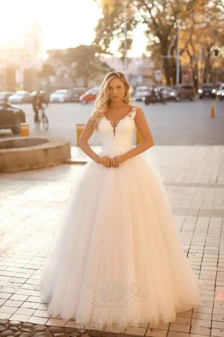 A 2112-es keringőruha elegáns, nőies és igazán báli megjelenést biztosít. A felsőrész V kivágású és vállpántos, kialakítása pedig halcsontokkal megerősített, így tökéletes tartást nyújt viselőjének. A felső részt díszítő csipke kristályokkal és gyöngyökkel van ékesítve, ami finom csillogást és luxus hatást kölcsönöz a ruhának.