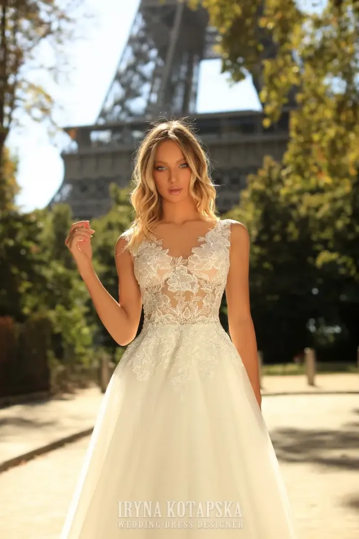 A felsőrész különlegessége, hogy a testsínű illúzió tüllre kézzel felvarrt csipke díszítés fedi, amely légies, mégis látványos hatást nyújt. A hát rész cipzárral és ékszergombokkal záródik, elegáns és kifinomult megjelenést adva.