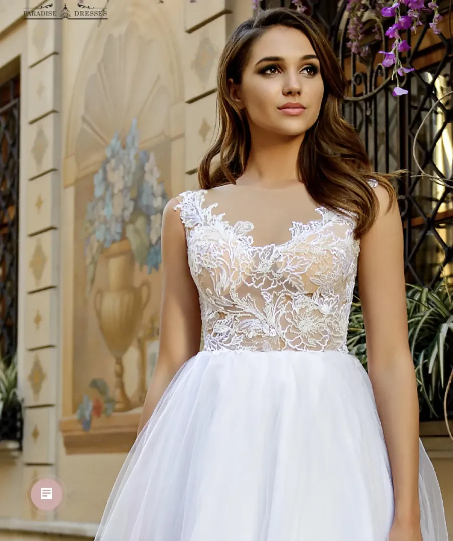 A Rosalie keringőruha igazi ragyogó megjelenést biztosít viselőjének. A felsőrész flitterekkel díszített csipkébőlkészült, amelyet illúzió tüll anyagra helyeztek, így elegáns, mégis könnyed hatást kelt. A hátat apró gombok zárják, amelyek nőies és finom részletet adnak a ruhának.